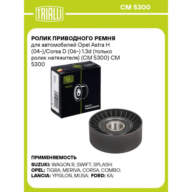 Ролик приводного ремня для автомобилей Opel Astra H (04-)/Corsa D (06-) 1.3d (только ролик натяжителя) (CM 5300) Характеристики: Артикул: CM 5300 OEM номера: 55562245, 55185074, 51821653, 468191460, 46819146, 6340676, 6340554, 55574238, 0636166, 17540-85E00, 636166, 4708770, 93193594, 1754085E00 Сопутствующие товары:: 6PK1310, 6PK1180, CM 5288 Сопутствующий товар: Ролики приводного ремня: CM 5288 Количество на автомобиль: 1 Внешний диаметр, мм: 65 Внутренний диаметр, мм: 25 Ширина, мм: 26 Гарантийный срок: 2 года/60 000 км. Материал: пластмасса/металл (сталь) Сопутствующий товар: Ремни: 6PK1310, 6PK1180 Товарная линейка: BLACK Комплектация: Ролик приводного ремня - 1 шт Гарантия: от 1 года.