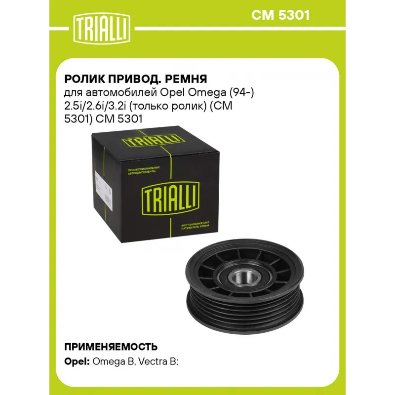 Ролик привод. ремня для автомобилей Opel Omega (94-) 2.5i/2.6i/3.2i (только ролик) (CM 5301) Характеристики: Артикул: CM 5301 OEM номера: 1340536, 1340547, 6340538, 1340512, 51 72 226, 51 72 275 Сопутствующие товары:: 6PK2260, 6PK2020, 6PK1900, CM 5290 Сопутствующий товар: Ролики приводного ремня: CM 5290 Количество на автомобиль: 1 Внешний диаметр, мм: 82 Внутренний диаметр, мм: 17 Ширина, мм: 27,5 Гарантийный срок: 2 года/60 000 км. Сопутствующий товар: Ремни: 6PK2260, 6PK2020, 6PK1900 Товарная линейка: BLACK Подходит для авто: Opel Omega B (94-), Vectra B (95-) Для проверки применяемости отправьте VIN автомобиля через вкладку "Есть вопросы о товаре?" Комплектация: Ролик приводного ремня - 1 шт Гарантия: от 1 года.