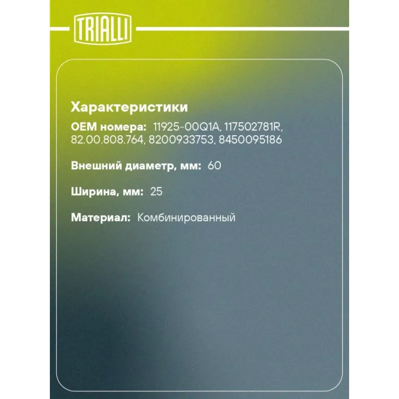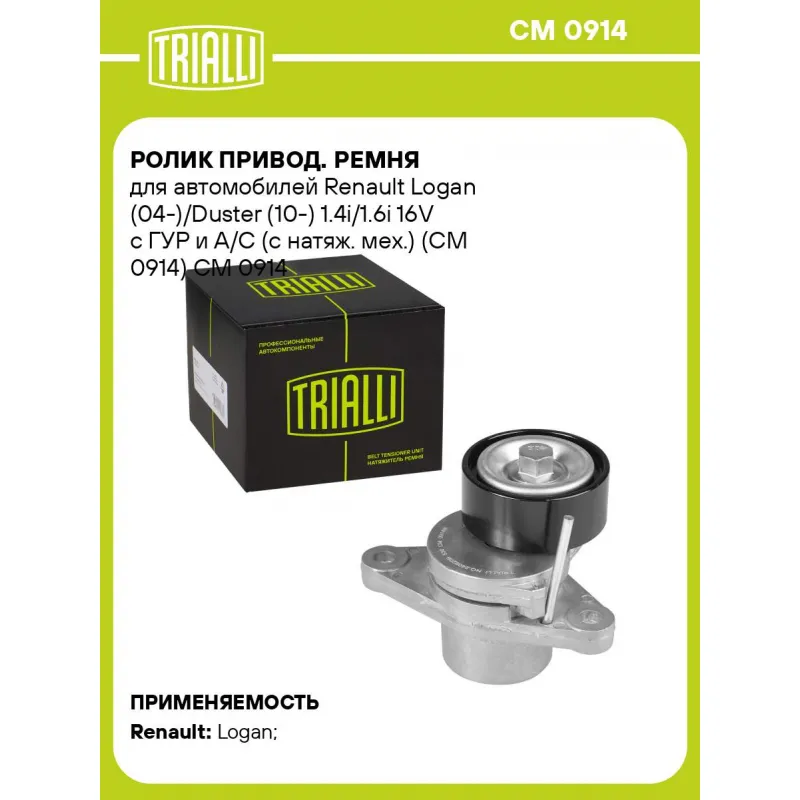 Ролик привод. ремня для автомобилей Renault Logan (04-)/Duster (10-) 1.4i/1.6i 16V с ГУР и A/C (с натяж. мех.) (CM 0914) Характеристики: Артикул: CM 0914 OEM номера: 11925-00Q1A, 117502781R, 82.00.808.764, 8200933753, 8450095186 Количество на автомобиль: 1 Внешний диаметр, мм: 60 Особенности конструкции:: механизм натяжения приводного ремня Ширина, мм: 25 Гарантийный срок: 2 года/60 000 км. Материал: Комбинированный Товарная линейка: BLACK Подходит для авто: Renault Logan (04-), Logan (04-) Для проверки применяемости отправьте VIN автомобиля через вкладку "Есть вопросы о товаре?" Комплектация: Ролик приводного ремня - 1 шт Гарантия: от 1 года.