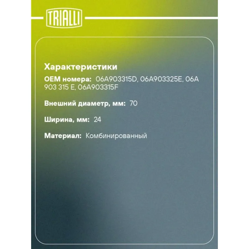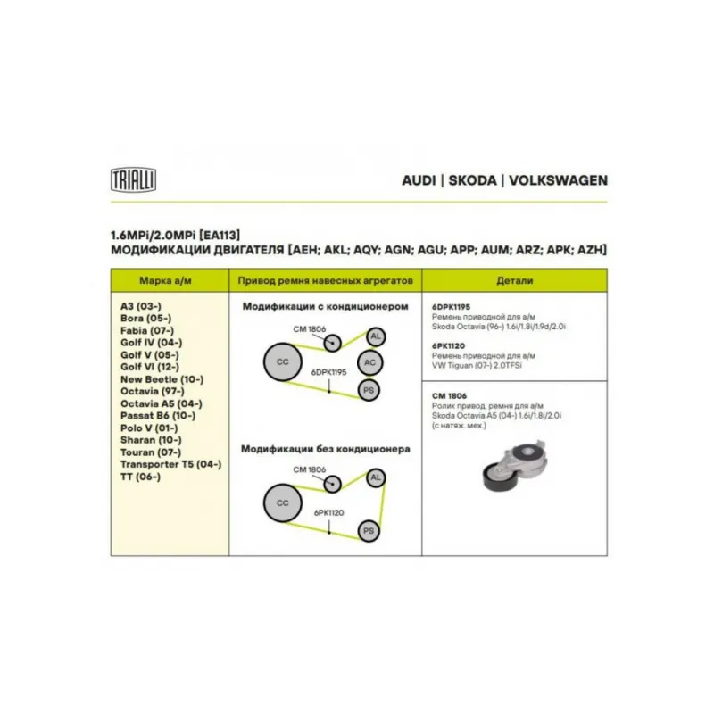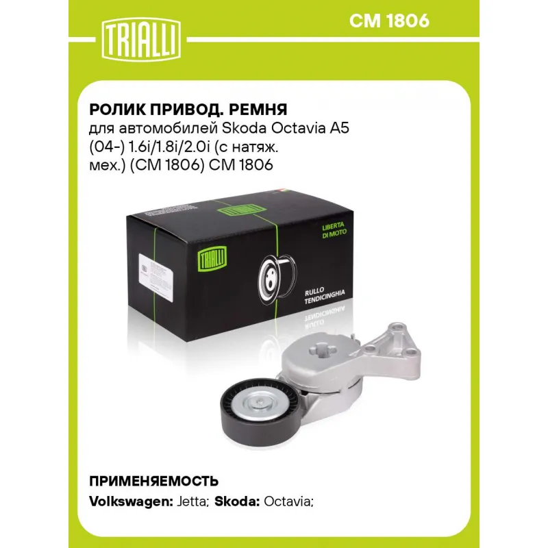 Ролик привод. ремня для автомобилей Skoda Octavia A5 (04-) 1.6i/1.8i/2.0i (с натяж. мех.) (CM 1806) Характеристики: Артикул: CM 1806 OEM номера: 06A903315D, 06A903325E, 06A 903 315 E, 06A903315F Количество на автомобиль: 1 Сопутствующие товары:: 6DPK1195, 6PK1120 Внешний диаметр, мм: 70 Особенности конструкции:: механизм натяжения приводного ремня Внутренний диаметр, мм: 12 Ширина, мм: 24 Гарантийный срок: 2 года/60 000 км. Материал: Комбинированный Сопутствующий товар: Ремни: 6DPK1195, 6PK1120 Товарная линейка: BLACK Подходит для авто: Volkswagen Jetta (05-) Skoda Octavia (96-) Для проверки применяемости отправьте VIN автомобиля через вкладку "Есть вопросы о товаре?" Комплектация: Ролик приводного ремня с натяж. мех. - 1 шт Гарантия: от 1 года.