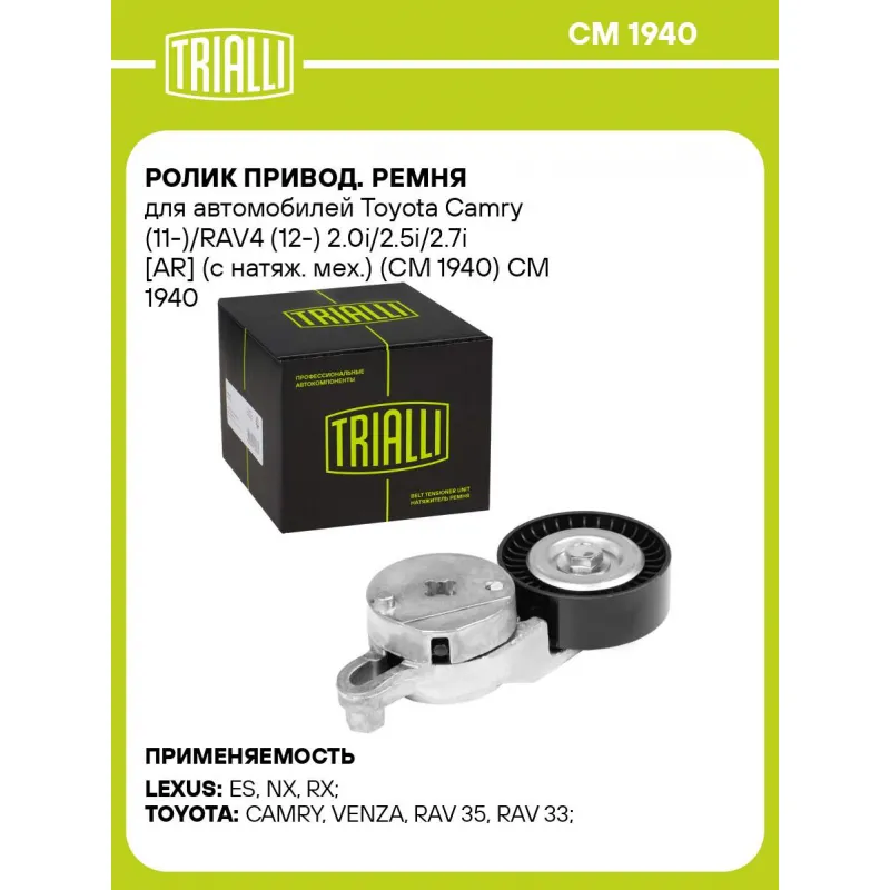 Ролик привод. ремня для автомобилей Toyota Camry (11-)/RAV4 (12-) 2.0i/2.5i/2.7i [AR] (с натяж. мех.) (CM 1940) Характеристики: Артикул: CM 1940 OEM номера: 16620-0V050, 16620-0V051, 16620-36013, 16620-36030, 166200V020, 166200V021, 166200V022, 166200V041, 166200V042, 1662036011, 16620-36010, 1662036012 Количество на автомобиль: 1 Внешний диаметр, мм: 70 Внутренний диаметр, мм: 8,2 Ширина, мм: 24 Гарантийный срок: 2 года/60 000 км. Товарная линейка: BLACK Комплектация: Ролик привод. ремня с натяж. мех. - 1 шт Гарантия: от 1 года.