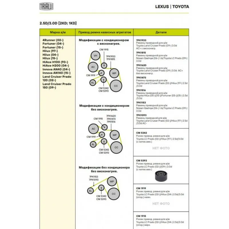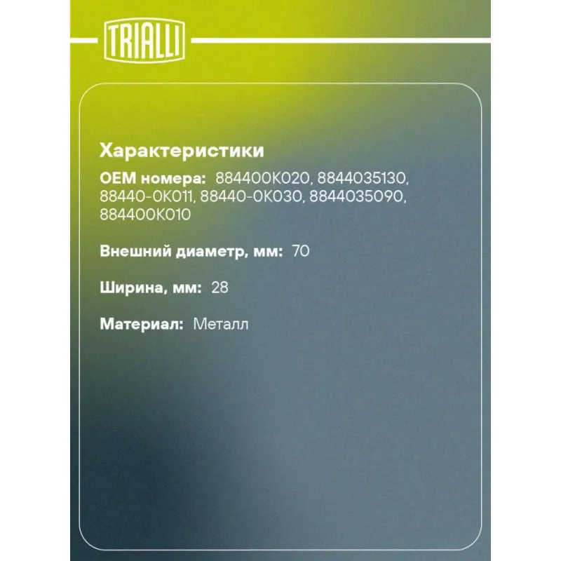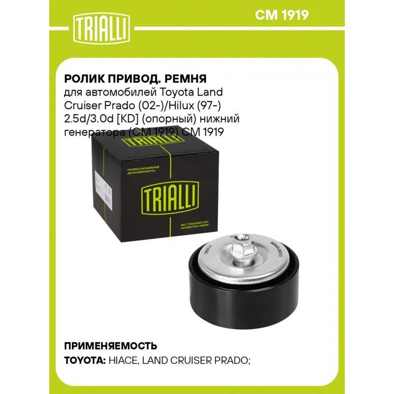 Ролик привод. ремня для автомобилей Toyota Land Cruiser Prado (02-)/Hilux (97-) 2.5d/3.0d [KD] (опорный) нижний генератора (CM 1919) Характеристики: Артикул: CM 1919 OEM номера: 884400K020, 8844035130, 88440-0K011, 88440-0K030, 8844035090, 884400K010 Количество на автомобиль: 1 Внешний диаметр, мм: 70 Внутренний диаметр, мм: 10 Ширина, мм: 28 Гарантийный срок: 2 года/60 000 км. Материал: Металл Товарная линейка: BLACK Комплектация: Ролик приводного ремня - 1 шт Гарантия: от 1 года.