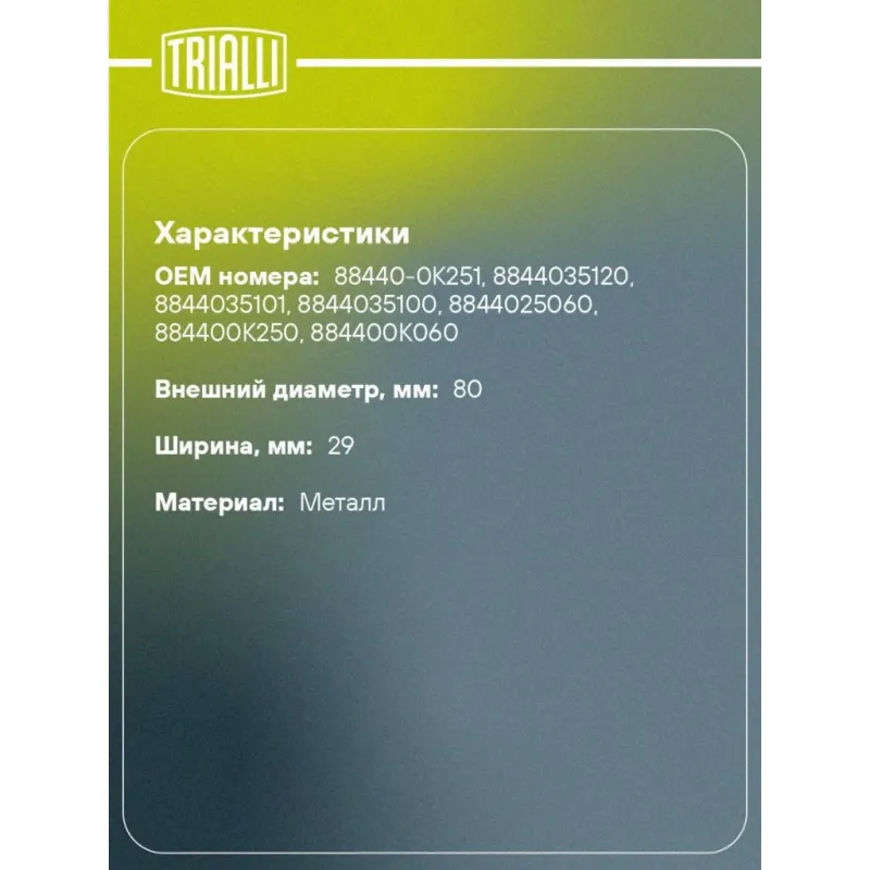 Ролик привод. ремня для автомобилей Toyota Lfnd Cruiser Prado (02-)/Hilux (97-) 2.5d/3.0d [KD] (опорный) верхний компрессора кондиционера Характеристики: Артикул: CM 1915 OEM номера: 88440-0K251, 8844035120, 8844035101, 8844035100, 8844025060, 884400K250, 884400K060 Количество на автомобиль: 1 Внешний диаметр, мм: 80 Внутренний диаметр, мм: 10 Ширина, мм: 29 Гарантийный срок: 2 года/60 000 км. Материал: Металл Товарная линейка: BLACK Комплектация: Ролик приводного ремня - 1 шт Гарантия: от 1 года.