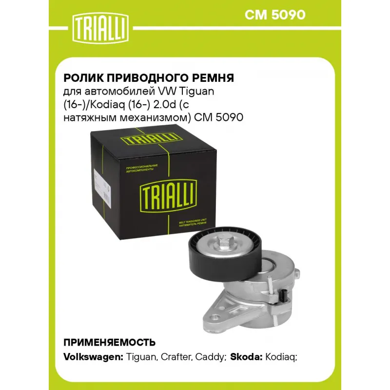 Ролик приводного ремня для автомобилей VW Tiguan (16-)/Kodiaq (16-) 2.0d (с натяжным механизмом) Характеристики: Артикул: CM 5090 OEM номера: 04L903315A, 04L903315B, 04L903315F, 04L903315K, 4L903315A, 4L903315B, 4L903315K, 04L 903 315 C, 04L 903 315 G, 04L 903 315 J Сопутствующие товары:: CM 5402, CM 5135, 6PK1613, 6PK1080, 4PK711E, 6PK844, 6PK976 Сопутствующий товар: Ролики приводного ремня: CM 5402, CM 5135 Количество на автомобиль: 1 Внешний диаметр, мм: 65 Внутренний диаметр, мм: 8,2 Ширина, мм: 24 Гарантийный срок: 2 года/60 000 км. Сопутствующий товар: Ремни: 6PK1613, 6PK1080, 4PK711E, 6PK844,6PK976 Товарная линейка: BLACK Подходит для авто: Volkswagen Tiguan (16-), Crafter (11-), Caddy (04-), Passat B8 (15-) Skoda Kodiaq (16-) Для проверки применяемости отправьте VIN автомобиля через вкладку "Есть вопросы о товаре?" Комплектация: Ролик привод. ремня с натяж. мех. - 1 шт Гарантия: от 1 года.