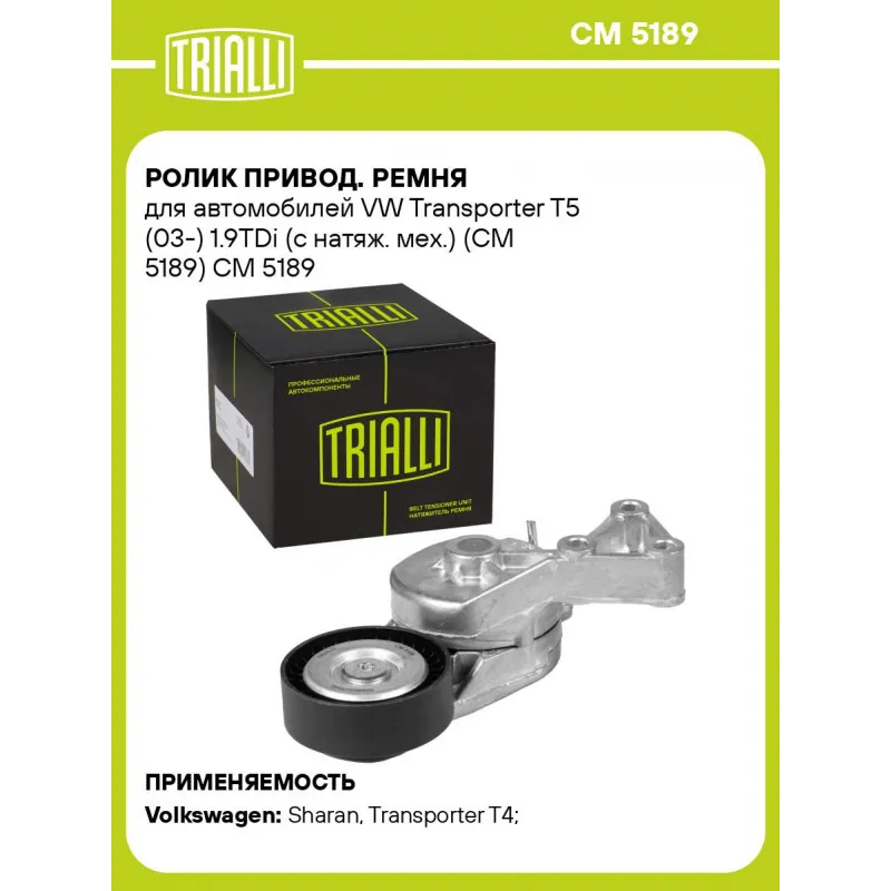 Ролик привод. ремня для автомобилей VW Transporter T5 (03-) 1.9TDi (с натяж. мех.) (CM 5189) Характеристики: Артикул: CM 5189 OEM номера: 038903315AE, 038903315F, 1122523, 1376631, YM216K254AA, YM216K254EA Количество на автомобиль: 1 Внешний диаметр, мм: 70,0 Внутренний диаметр, мм: 8,2 Ширина, мм: 24 Гарантийный срок: 2 года/60 000 км. Материал: металл/пластик Сопутствующие товары:: 6DPK1195, 6PK1120 Сопутствующий товар: Ремни: 6DPK1195, 6PK1120 Товарная линейка: BLACK Тип ролика: ГРМ Подходит для авто: Volkswagen Sharan (95-), Transporter T4 (90-) Для проверки применяемости отправьте VIN автомобиля через вкладку "Есть вопросы о товаре?" Комплектация: Ролик привод. ремня с натяж. мех. - 1 шт Гарантия: от 1 года.