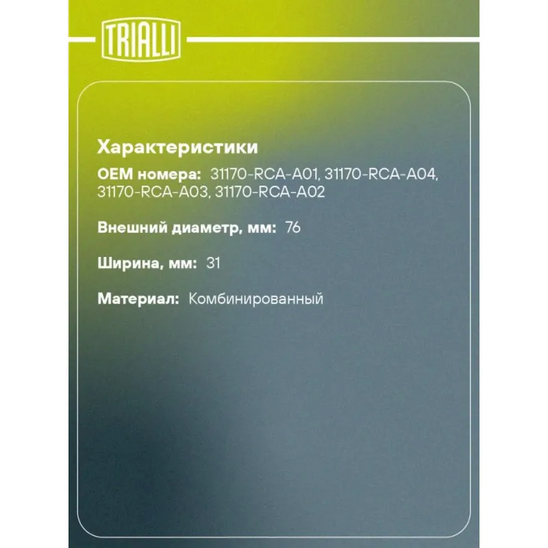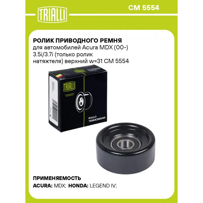 Ролик приводного ремня для автомобилей Acura MDX (00-) 3.5i/3.7i (только ролик натяжтеля) верхний w=31 Характеристики: Артикул: CM 5554 OEM номера: 31170-RCA-A01, 31170-RCA-A04, 31170-RCA-A03, 31170-RCA-A02 Сопутствующий товар: Ролики приводного ремня: CM 5437, CM 5549, CM 5731 Количество на автомобиль: 1 Внешний диаметр, мм: 76 Ширина, мм: 31 Гарантийный срок: 2 года/60 000 км. Сопутствующий товар: Ремни: 6PK2138 Товарная линейка: BLACK Комплектация: Ролик приводного ремня - 1 шт Гарантия: от 1 года.