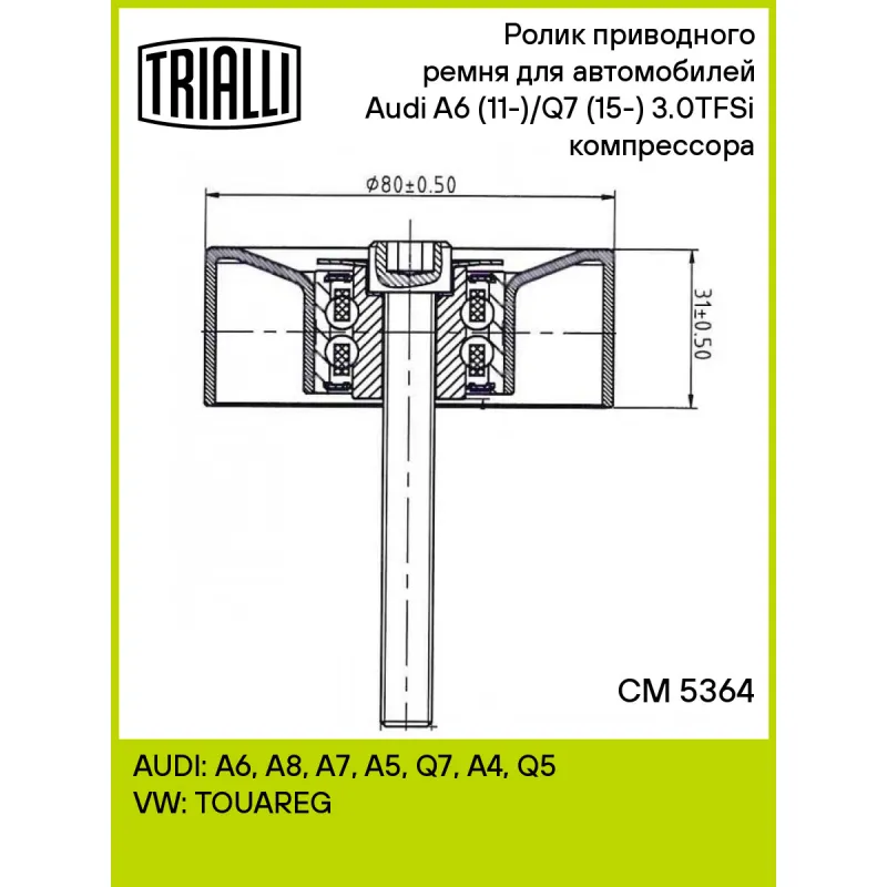 Ролик приводного ремня для автомобилей Audi A6 (11-)/Q7 (15-) 3.0TFSi (опорный) компрессора Характеристики: Артикул: CM 5364 OEM номера: 06E 903 341 E, 06E 903 341 H, 958 102 118 00, 958 102 118 01 Сопутствующие товары:: CM 5379, CM 5418,CM 5816, 6PK2415, 6PK2285, 6PK2330, 7PK1275 Сопутствующий товар: Ремни: 6PK2415, 6PK2285, 6PK2330, 7PK1275 Товарная линейка: BLACK Количество на автомобиль: 1 Внешний диаметр, мм: 80 Внутренний диаметр, мм: 10 Ширина, мм: 31 Гарантийный срок: 2 года/60 000 км. Материал: Металл Комплектация: Ролик приводного ремня - 1 шт Гарантия: от 1 года.