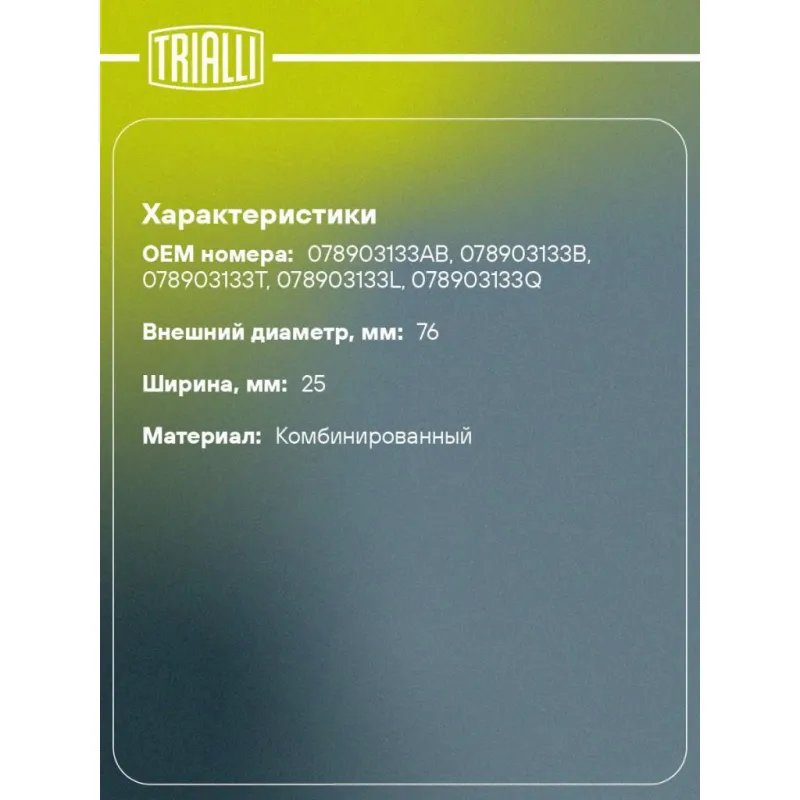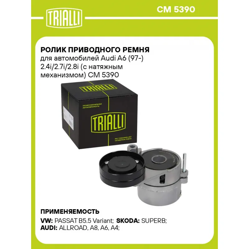 Ролик приводного ремня для автомобилей Audi A6 (97-) 2.4i/2.7i/2.8i (с натяжным механизмом) Характеристики: Артикул: CM 5390 OEM номера: 078903133AB, 078903133B, 078903133T, 078903133L, 078903133Q Сопутствующие товары:: 6PK1880, 6PK1856, 6PK1760, 6PK1733 Сопутствующий товар: Ремни: 6PK1880, 6PK1856, 6PK1760, 6PK1733 Товарная линейка: BLACK Количество на автомобиль: 1 Внешний диаметр, мм: 76 Ширина, мм: 25 Гарантийный срок: 2 года/60 000 км. Материал: Комбинированный Комплектация: Ролик привод. ремня с натяж. мех. - 1 шт Гарантия: от 1 года.