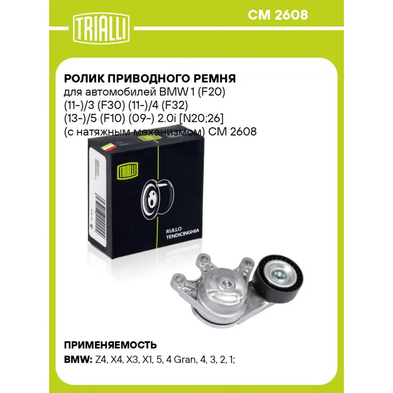 Ролик приводного ремня для автомобилей BMW 1 (F20) (11-)/3 (F30) (11-)/4 (F32) (13-)/5 (F10) (09-) 2.0i [N20;26] (с натяжным механизмом) Характеристики: Артикул: CM 2608 OEM номера: 11 28 7 594 969, 9670725780 Сопутствующие товары:: 6PK1005, CM 5262 Сопутствующий товар: Ролики приводного ремня: CM 5262 Количество на автомобиль: 1 Внешний диаметр, мм: 65 Внутренний диаметр, мм: 8,2 Ширина, мм: 25 Гарантийный срок: 2 года/60 000 км. Сопутствующий товар: Ремни: 6PK1005 Товарная линейка: BLACK Комплектация: Ролик привод. ремня с натяж. мех. - 1 шт Гарантия: от 1 года.