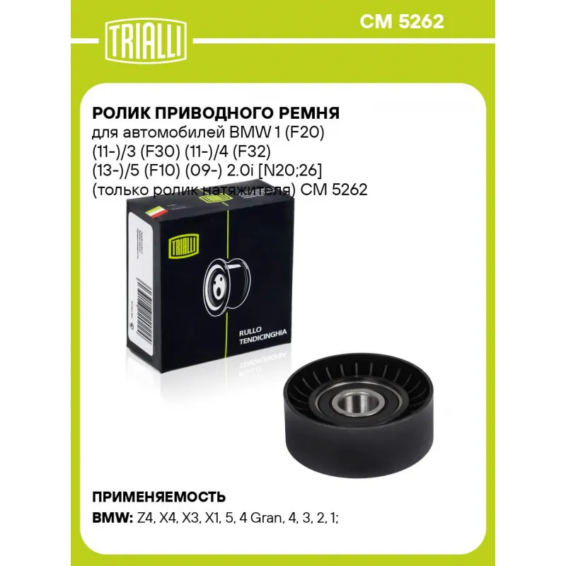 Ролик приводного ремня для автомобилей BMW 1 (F20) (11-)/3 (F30) (11-)/4 (F32) (13-)/5 (F10) (09-) 2.0i [N20;26] (только ролик натяжителя) Характеристики: Артикул: CM 5262 OEM номера: 11 28 7 594 969, 9670725780 Сопутствующие товары:: 6PK1005, CM 2608 Сопутствующий товар: Ролики приводного ремня: CM 2608 Количество на автомобиль: 1 Внешний диаметр, мм: 65 Ширина, мм: 25 Гарантийный срок: 2 года/60 000 км. Сопутствующий товар: Ремни: 6PK1005 Товарная линейка: BLACK Комплектация: Ролик приводного ремня - 1 шт Гарантия: от 1 года.