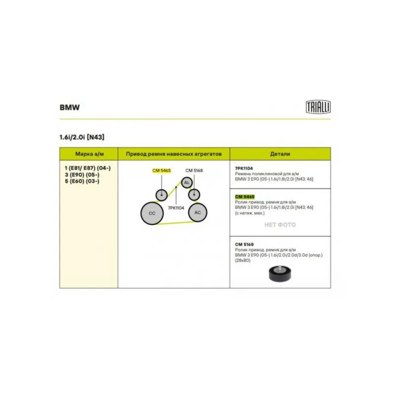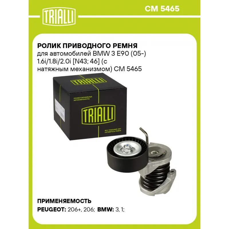 Ролик приводного ремня для автомобилей BMW 3 E90 (05-) 1.6i/1.8i/2.0i [N43; 46] (с натяжным механизмом) Характеристики: Артикул: CM 5465 OEM номера: 11287558752 Сопутствующие товары:: 7PK1104, CM 5168 Количество на автомобиль: 1 Внешний диаметр, мм: 70 Ширина, мм: 28 Гарантийный срок: 2 года/60 000 км. Материал: Комбинированный Сопутствующий товар: Ремни: 7PK1104 Товарная линейка: BLACK Комплектация: Ролик привод. ремня с натяж. мех. - 1 шт Гарантия: от 1 года.