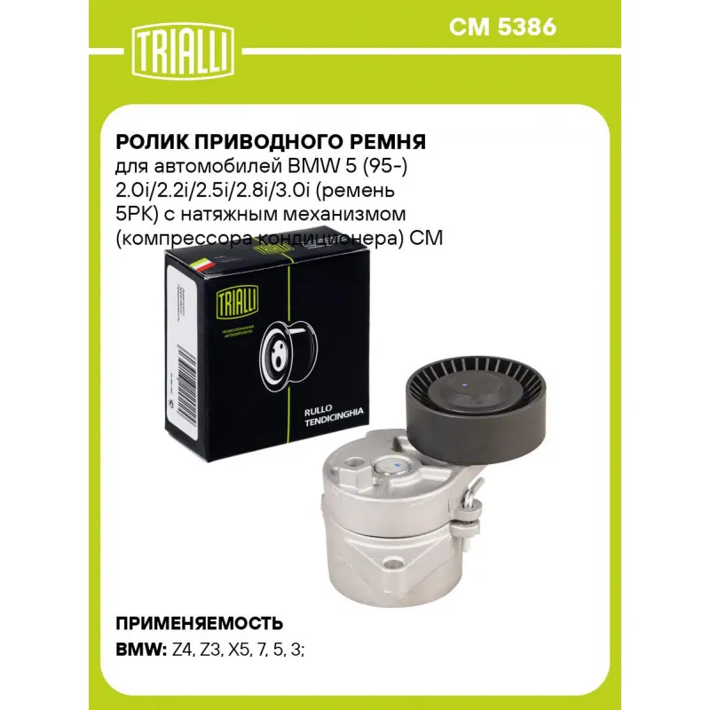Ролик приводного ремня для автомобилей BMW 5 (95-) 2.0i/2.2i/2.5i/2.8i/3.0i (ремень 5PK) с натяжным механизмом (компрессора кондиционера) Характеристики: Артикул: CM 5386 OEM номера: 1433571, 11281433571 Сопутствующие товары:: CM 5497, CM 5845, CM 5444, CM 5411 Сопутствующий товар: Ролики приводного ремня: CM 5497, CM 5845, CM 5444, CM 5411 Количество на автомобиль: 1 Внешний диаметр, мм: 70 Ширина, мм: 26 Гарантийный срок: 2 года/60 000 км. Товарная линейка: BLACK Комплектация: Ролик привод. ремня с натяж. мех. - 1 шт Гарантия: от 1 года.