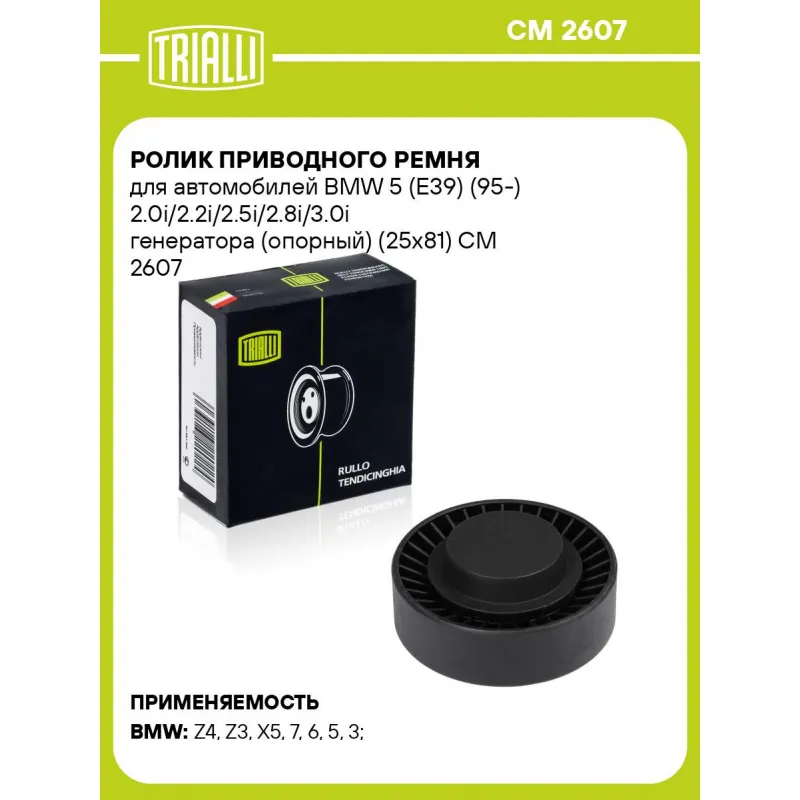 Ролик приводного ремня для автомобилей BMW 5 (E39) (95-) 2.0i/2.2i/2.5i/2.8i/3.0i генератора (опорный) (25x81) Характеристики: Артикул: CM 2607 OEM номера: 11 28 7 841 228, 7841228, 1748130, 1738061, 1730571, 1726181, 11281748130, 11281738605, 11281738061, 11 28 1 730 571, 11281726181, 1738605 Сопутствующий товар: Ролики приводного ремня: CM 5104, CM 2602, CM 5713 Количество на автомобиль: 1 Сопутствующие товары:: 6PK1560, 6PK1555, 6PK1538, 5PK890, 5PK906, 5PK865, 4PK845, CM 5104, CM 2602, CM 5713 Внешний диаметр, мм: 80 Внутренний диаметр, мм: 10 Ширина, мм: 25 Гарантийный срок: 2 года/60 000 км. Материал: Комбинированный Сопутствующий товар: Ремни: 6PK1560, 6PK1555, 6PK1538, 5PK890, 5PK906, 5PK865, 4PK845 Товарная линейка: BLACK Комплектация: Ролик приводного ремня - 1 шт Гарантия: от 1 года.