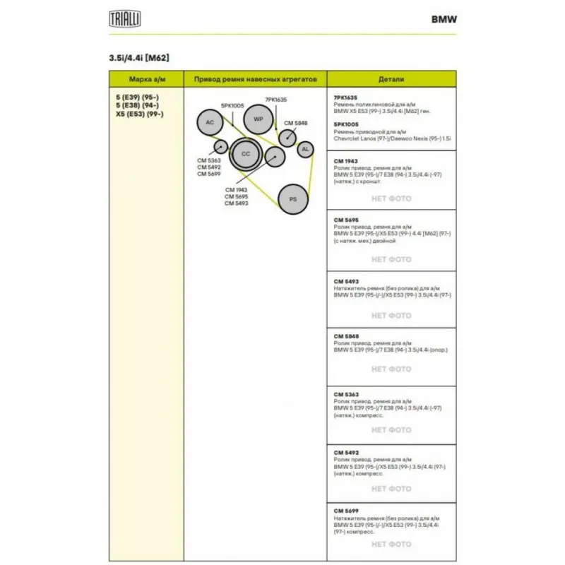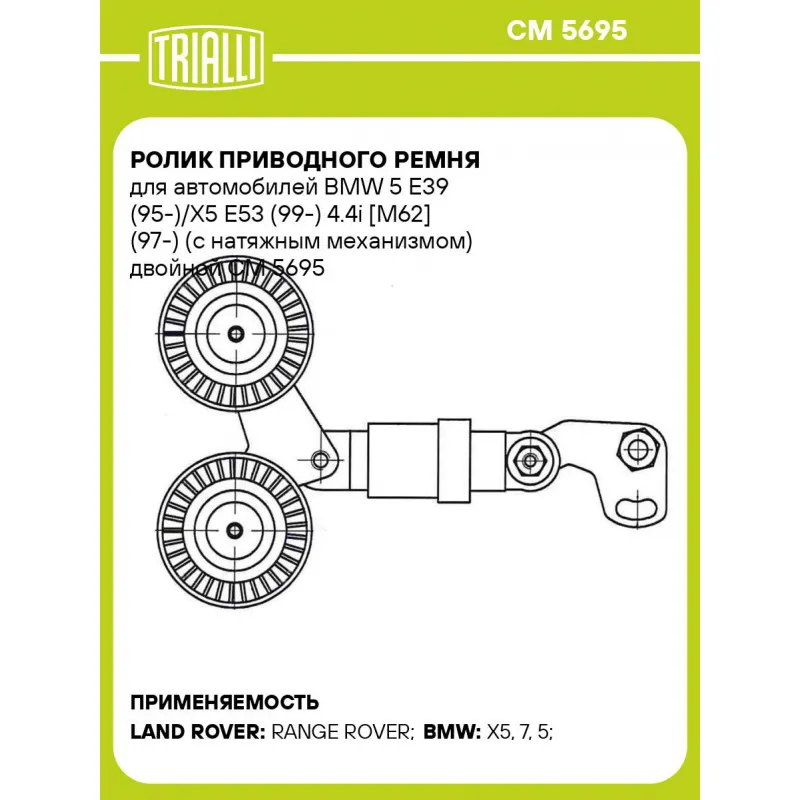 Ролик приводного ремня для автомобилей BMW 5 E39 (95-)/X5 E53 (99-) 4.4i [M62] (97-) (с натяжным механизмом) двойной Характеристики: Артикул: CM 5695 OEM номера: PQR000170, 11287515865, 11287503424 Сопутствующие товары:: 7PK1635, 5PK1005, CM 5493, CM 1943, CM 5848, CM 5363, CM 5492, CM 5699 Сопутствующий товар: Ремни: 7PK1635, 5... Читать полностью →