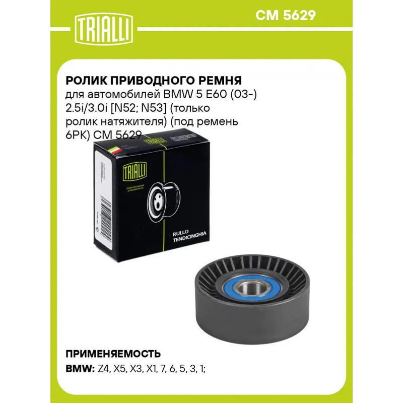 Ролик приводного ремня для автомобилей BMW 5 E60 (03-) 2.5i/3.0i [N52; N53] (только ролик натяжителя) (под ремень 6PK) Характеристики: Артикул: CM 5629 OEM номера: 11 28 7 530 314, 11 28 8 624 196, 7530314, 8624196 Сопутствующие товары:: CM 5374, CM 5507, CM 5689,CM 5685, CM 5686 Сопутствующий товар: Ролики приводного ремня: CM 5374, CM 5507, CM 5689, CM 5685, CM 5686 Количество на автомобиль: 1 Внешний диаметр, мм: 70 Ширина, мм: 26 Гарантийный срок: 2 года/60 000 км. Материал: металл/пластик Товарная линейка: BLACK Комплектация: Ролик привод. ремня - 1 шт Гарантия: от 1 года.
