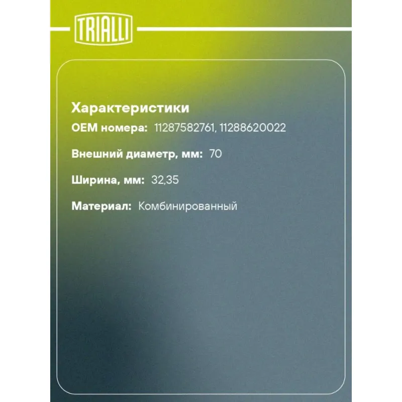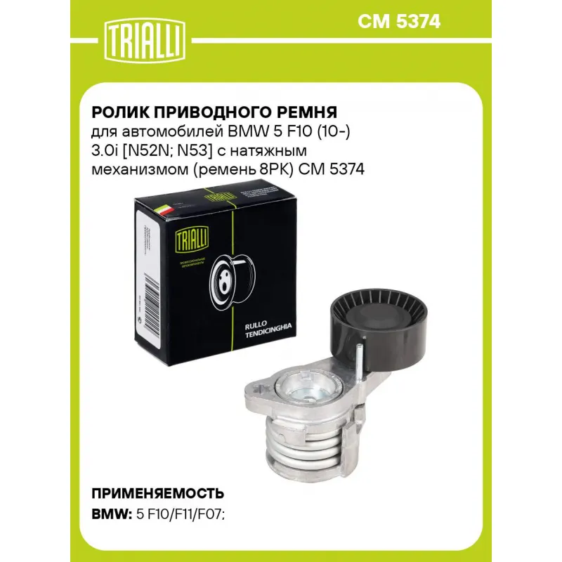 Ролик приводного ремня для автомобилей BMW 5 F10 (10-) 3.0i [N52N; N53] с натяжным механизмом (ремень 8PK) Характеристики: Артикул: CM 5374 OEM номера: 11287582761, 11288620022 Сопутствующие товары:: CM 5629, CM 5507, CM 5689,CM 5685, CM 5686 Сопутствующий товар: Ролики приводного ремня: CM 5629, CM 5507, CM 5689, CM 5685, CM 5686 Количество на автомобиль: 1 Внешний диаметр, мм: 70 Внутренний диаметр, мм: 13 Ширина, мм: 32,35 Гарантийный срок: 2 года/60 000 км. Товарная линейка: BLACK Подходит для авто: BMW 5 F10/F11/F07 (10-) Для проверки применяемости отправьте VIN автомобиля через вкладку "Есть вопросы о товаре?" Комплектация: Ролик привод. ремня с натяж. мех. - 1 шт Гарантия: от 1 года.