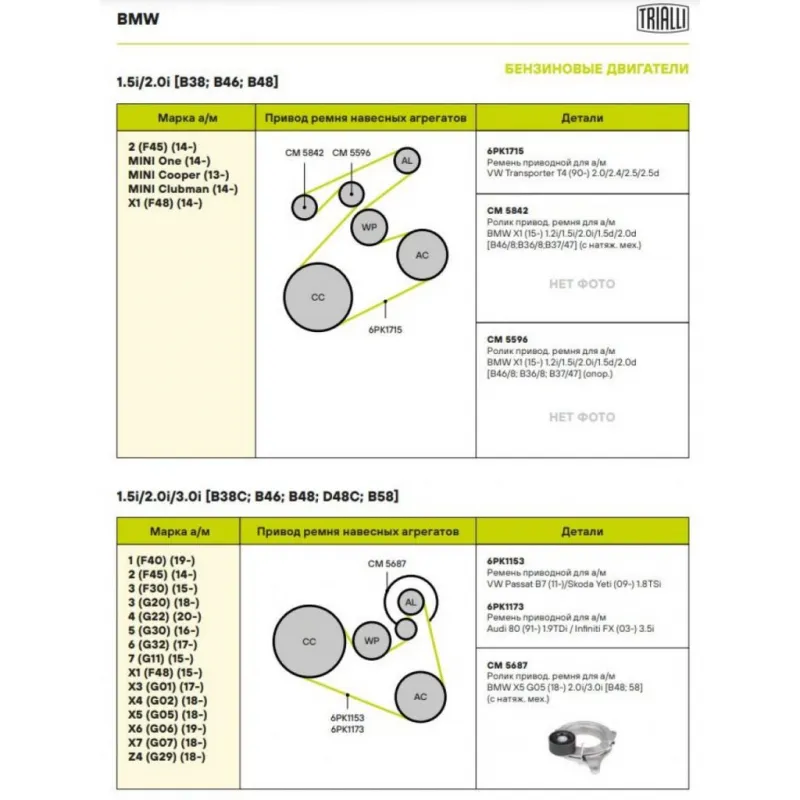 Ролик приводного ремня для автомобилей BMW X1 F48 (15-) 1.2i/1.5i/2.0i/1.5d/2.0d [B46/8;36/8;37/7] (с натяжным механизмом) Характеристики: Артикул: CM 5842 OEM номера: 11 28 8 479 475, 11 28 8 617 229, 11 28 8 600 357 Сопутствующие товары:: 6PK1715, CM 5596 Ширина, мм: 25,5 Внешний диаметр, мм: 65 Сопутствующий товар: Ремни: 6PK1715 Количество на автомобиль: 1 Гарантийный срок: 2 года/60 000 км. Материал: Комбинированный Товарная линейка: BLACK Комплектация: Ролик привод. ремня с натяж. мех. - 1 шт Гарантия: от 1 года.