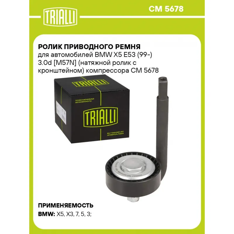Ролик приводного ремня для автомобилей BMW X5 E53 (99-) 3.0d [M57N] (натяжной ролик с кронштейном) компрессора Характеристики: Артикул: CM 5678 OEM номера: 64557786706 Сопутствующие товары:: 6PK2080, 6PK2160, 4PK836, 4PK885, 4PK863, 4PK830E, CM 5081, CM 5679, CM 5680, CM 5857, CM 5469 Сопутствующий товар: Ролики приводного ремня: CM 5081, CM 5679, CM 5680, CM 5857, CM 5469 Количество на автомобиль: 1 Внешний диаметр, мм: 65 Ширина, мм: 21 Гарантийный срок: 2 года/60 000 км. Сопутствующий товар: Ремни: 6PK2080, 6PK2160, 4PK836, 4PK885, 4PK863, 4PK830E Товарная линейка: BLACK Комплектация: Ролик привод. ремня с кронштейном - 1 шт Гарантия: от 1 года.