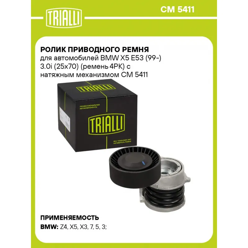 Ролик приводного ремня для автомобилей BMW X5 E53 (99-) 3.0i (25x70) (ремень 4PK) с натяжным механизмом Характеристики: Артикул: CM 5411 OEM номера: 11 28 7 512 758, 7 512 758 Сопутствующие товары:: CM 5497, CM 5845, CM 5386, CM 5444 Ширина, мм: 26 Внешний диаметр, мм: 70 Внутренний диаметр, мм: 10.2 Количество на автомобиль: 1 ... Читать полностью →