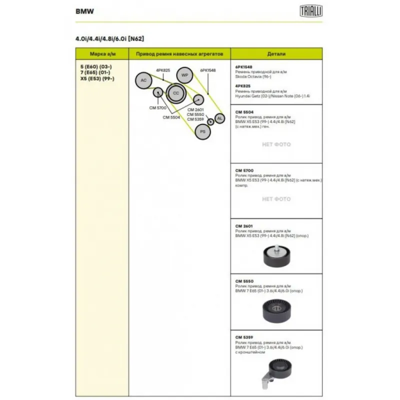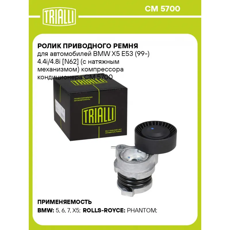 Ролик приводного ремня для автомобилей BMW X5 E53 (99-) 4.4i/4.8i [N62] (с натяжным механизмом) компрессора кондиционера Характеристики: Артикул: CM 5700 OEM номера: 11 28 0 415 304, 11 28 7 505 224, 11287549588 Сопутствующие товары:: 6PK1548, 4PK825, CM 5504, CM 2601, CM 5550, CM 5359 Ширина, мм: 26 Внешний диаметр, мм: 70 Внутренний диаметр, мм: 10.2 Сопутствующий товар: Ремни: 6PK1548, 4PK825 Количество на автомобиль: 1 Гарантийный срок: 2 года/60 000 км. Материал: Комбинированный Товарная линейка: BLACK Комплектация: Ролик привод. ремня с натяж. мех. - 1 шт Гарантия: от 1 года.