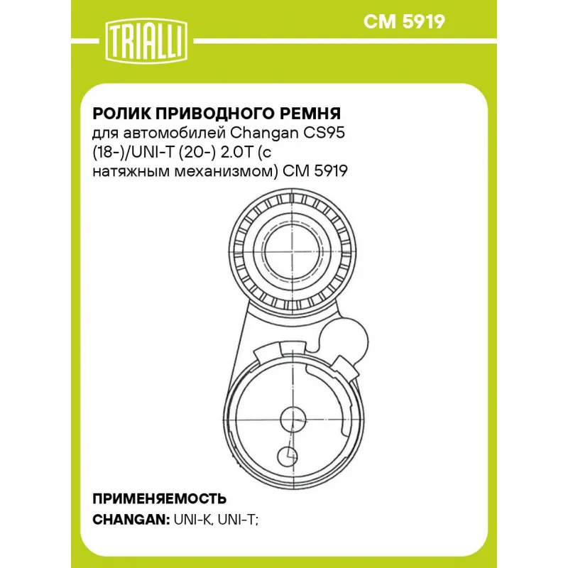 Ролик приводного ремня для автомобилей Changan CS95 (18-)/UNI-T (20-) 2.0T (с натяжным механизмом) Характеристики: Артикул: CM 5919 OEM номера: D20T014-1920 Сопутствующие товары:: 6PK1940, CM 5920 Ширина, мм: 26 Внешний диаметр, мм: 60 Гарантийный срок: 2 года/60 000 км. Сопутствующий товар: Ремни: 6PK1940 Количество на автомоби... Читать полностью →