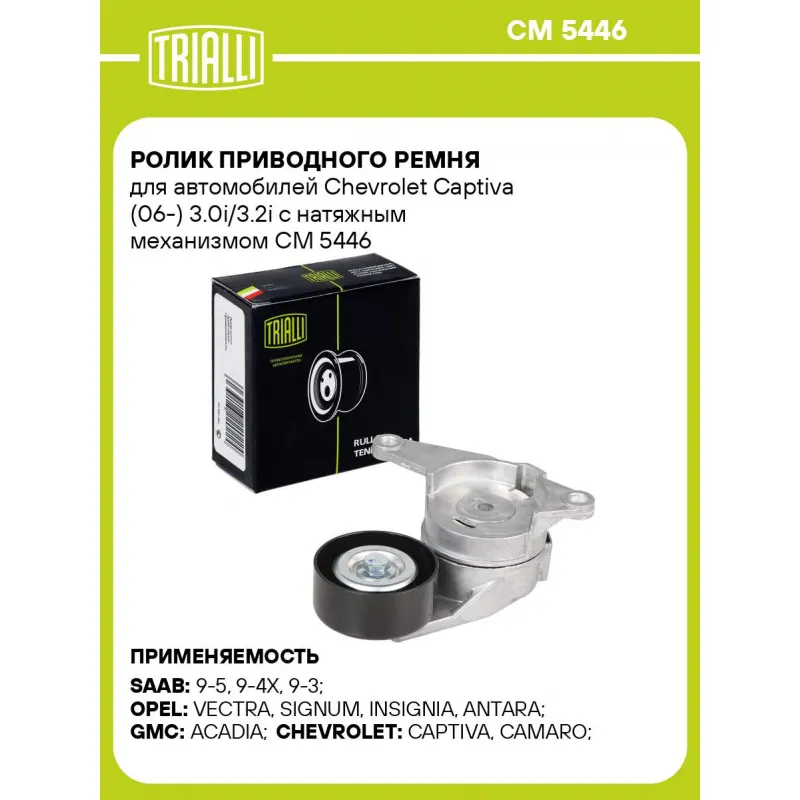 Ролик приводного ремня для автомобилей Chevrolet Captiva (06-) 3.0i/3.2i с натяжным механизмом Характеристики: Артикул: CM 5446 OEM номера: 71770693, 71741116, 12575509, 12626644, 4817877 Сопутствующие товары:: 6PK2415, 6PK2390, CM 5846, CM 5860 Сопутствующий товар: Ролики приводного ремня: CM 5846, CM 5860 Количество на автомобиль: 1 Внешний диаметр, мм: 70 Ширина, мм: 31 Гарантийный срок: 2 года/60 000 км. Материал: Комбинированный Сопутствующий товар: Ремни: 6PK2415, 6PK2390 Товарная линейка: BLACK Комплектация: Ролик привод. ремня с натяж. мех. - 1 шт Гарантия: от 1 года.