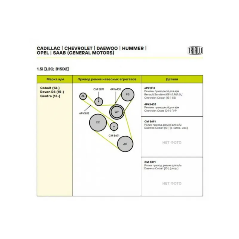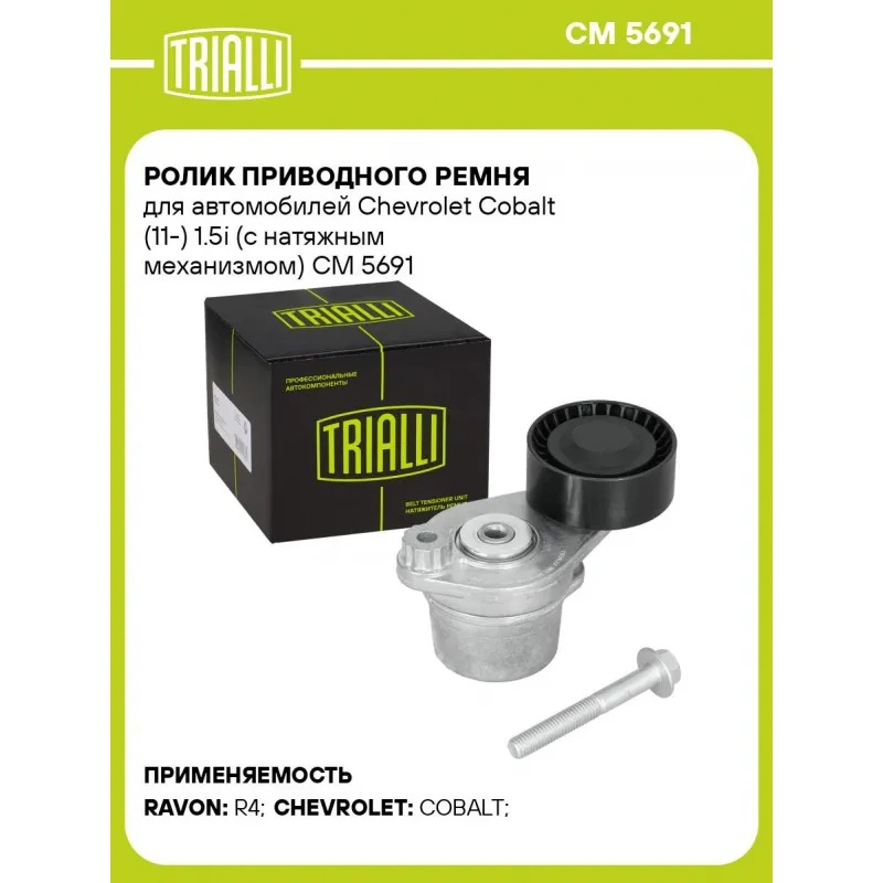 Ролик приводного ремня для автомобилей Chevrolet Cobalt (11-) 1.5i (с натяжным механизмом) Характеристики: Артикул: CM 5691 OEM номера: 25183297 Сопутствующие товары:: 6PK1815, 4PK643E, 5871 Сопутствующий товар: Ремни: 6PK1815, 4PK643E Количество на автомобиль: 1 Гарантийный срок: 2 года/60 000 км. Материал: Комбинированный Товарная линейка: BLACK Комплектация: Ролик приводного ремня - 1 шт Гарантия: от 1 года.