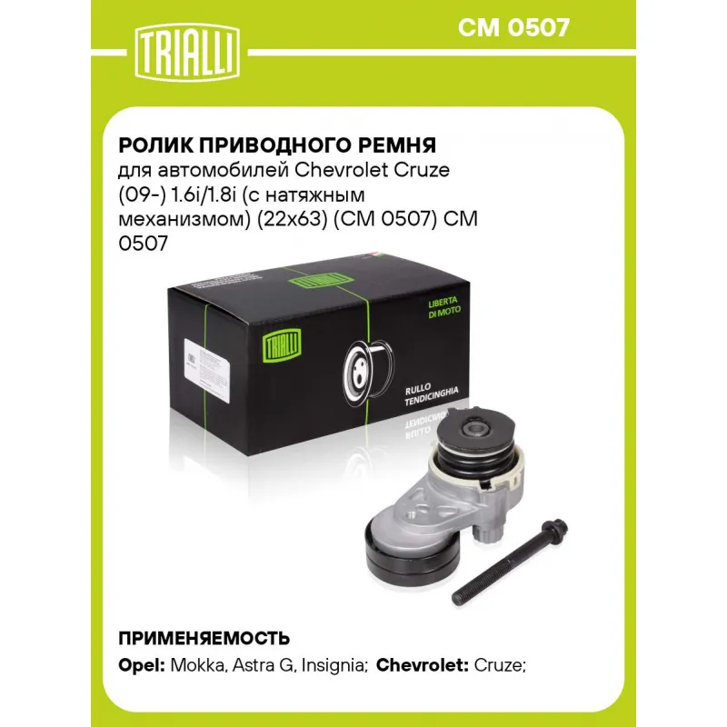 Ролик приводного ремня для автомобилей Chevrolet Cruze (09-) 1.6i/1.8i (с натяжным механизмом) (22x63) (CM 0507) Характеристики: Артикул: CM 0507 OEM номера: 55556090, 25185910, 25189926, 25191534, 96802494, 96807494, 55593512, 636485, 1340268, 55350422, 55563512, 6040558, 6340552, 6340558, 636319 Сопутствующий товар: Ролики приводного ремня: CM 0501 Количество на автомобиль: 1 Сопутствующие товары:: 6PK1555, 5PK1546, 6PK1453, 5PK1450, 4PK643E, CM 0501 Внешний диаметр, мм: 63 Особенности конструкции:: механизм натяжения приводного ремня Ширина, мм: 22 Гарантийный срок: 2 года/60 000 км. Материал: Комбинированный Сопутствующий товар: Ремни: 6PK1555, 5PK1546, 6PK1453, 5PK1450, 4PK643E Товарная линейка: BLACK Подходит для авто: Opel Mokka (13-), Astra G (98-), Insignia (08-) Chevrolet Cruze (09-) Для проверки применяемости отправьте VIN автомобиля через вкладку "Есть вопросы о товаре?" Комплектация: Ролик приводного ремня - 1 шт Гарантия: от 1 года.
