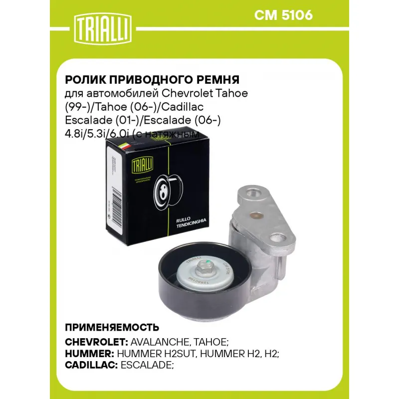 Ролик приводного ремня для автомобилей Chevrolet Tahoe (99-)/Tahoe (06-)/Cadillac Escalade (01-)/Escalade (06-) 4.8i/5.3i/6.0i (с натяжным механизмом) компрессора кондиционера Характеристики: Артикул: CM 5106 OEM номера: 12580196, 12565372, 12562065 Сопутствующие товары:: 6PK2345, 6PK2360, 6PK2370, 4PK962, 4PK1010E, CM 5862, CM 5609 Сопутствующий товар: Ролики приводного ремня: CM 5862, CM 5609 Количество на автомобиль: 1 Внешний диаметр, мм: 60 Внутренний диаметр, мм: 10 Ширина, мм: 21.5 Гарантийный срок: 2 года/60 000 км. Сопутствующий товар: Ремни: 6PK2345, 6PK2360, 6PK2370, 4PK962, 4PK1010E Товарная линейка: BLACK Комплектация: Ролик привод. ремня с натяж. мех. - 1 шт Гарантия: от 1 года.