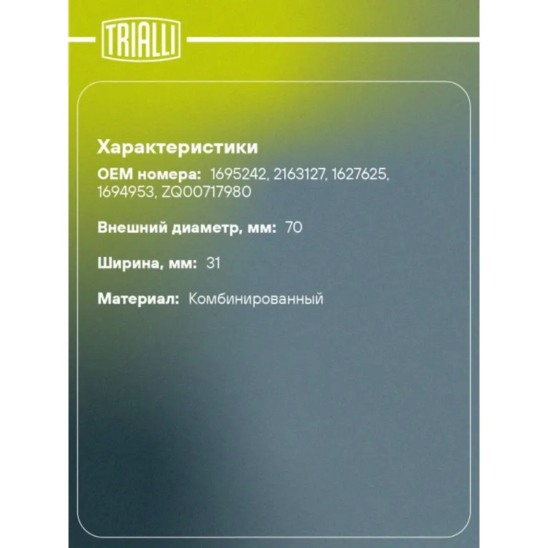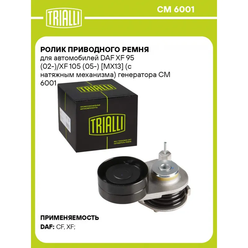 Ролик приводного ремня для автомобилей DAF XF 95 (02-)/XF 105 (05-) [MX13] (с натяжным механизма) генератора Характеристики: Артикул: CM 6001 OEM номера: 1695242, 2163127, 1627625, 1694953, ZQ00717980 Ширина, мм: 31 Внешний диаметр, мм: 70 Внутренний диаметр, мм: 10,2 Гарантийный срок: 2 года/60 000 км. Количество на автомобиль:... Читать полностью →
