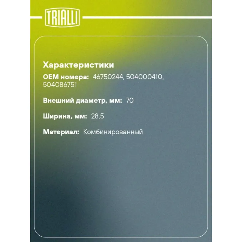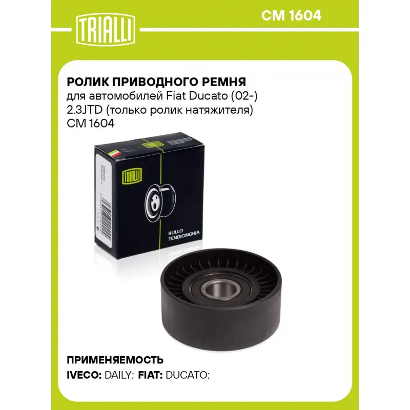 Ролик приводного ремня для автомобилей Fiat Ducato (02-) 2.3JTD (только ролик натяжителя) Характеристики: Артикул: CM 1604 OEM номера: 46750244, 504000410, 504086751 Сопутствующий товар: Ролики приводного ремня: CMS 1604, CM 1603, CM 5325 Количество на автомобиль: 1 Сопутствующие товары:: 7PK1076, 4PK985, 4PK903E, CMS 1604, CM 1603, CM 5325 Внешний диаметр, мм: 70 Внутренний диаметр, мм: 17 Ширина, мм: 28,5 Гарантийный срок: 2 года/60 000 км. Материал: Комбинированный Сопутствующий товар: Ремни: 7PK1076, 4PK985, 4PK903E Товарная линейка: BLACK Комплектация: Ролик приводного ремня - 1 шт Гарантия: от 1 года.