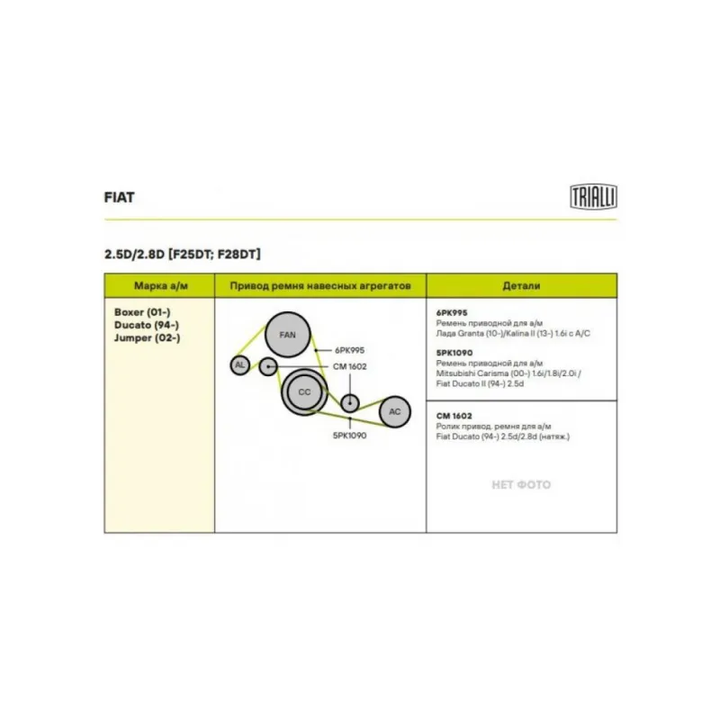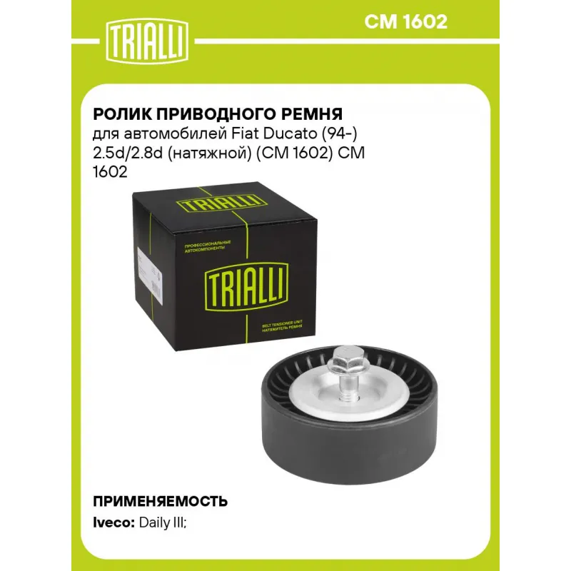 Ролик приводного ремня для автомобилей Fiat Ducato (94-) 2.5d/2.8d (натяжной) (CM 1602) Характеристики: Артикул: CM 1602 OEM номера: 6453FL, 500316890, 5003 441 32, 6453-FL Сопутствующие товары:: 6PK995, 5PK1090 Количество на автомобиль: 1 Внешний диаметр, мм: 70 Особенности конструкции:: опорный (паразитный) Внутренний диаметр, мм: 8 Ширина, мм: 25 Гарантийный срок: 2 года/60 000 км. Сопутствующий товар: Ремни: 6PK995, 5PK1090 Товарная линейка: BLACK Подходит для авто: Iveco Daily III (99-) Для проверки применяемости отправьте VIN автомобиля через вкладку "Есть вопросы о товаре?" Комплектация: Ролик привод. ренмя - 1 шт Гарантия: от 1 года.