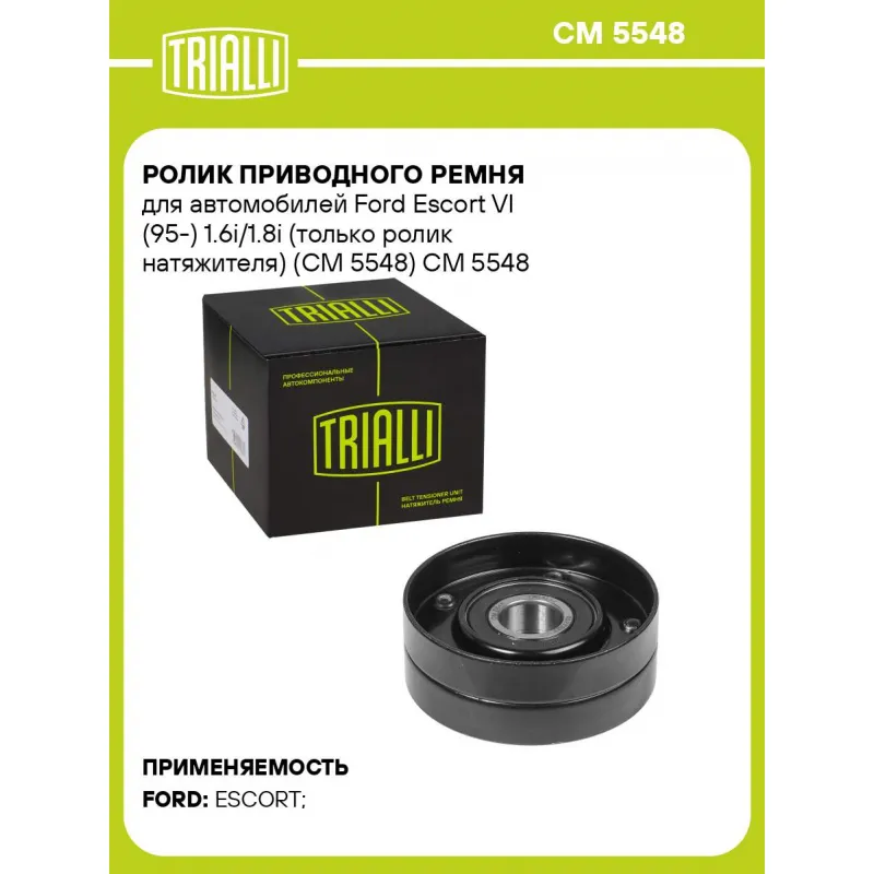 Ролик приводного ремня для автомобилей Ford Escort VI (95-) 1.6i/1.8i (только ролик натяжителя) (CM 5548) Характеристики: Артикул: CM 5548 OEM номера: 6 577 227, 928F 6A228 AB, 6 710 259 Сопутствующие товары:: 6PK1905, 6PK1920, 6PK1820, 6PK2100, 6PK2120, 6PK1675, 6PK1264, 6PK1653, 6PK1973, 6PK1538, 6PK1555, 6PK915, CM 5349 Количество на автомобиль: 1 Внешний диаметр, мм: 70 Ширина, мм: 25 Гарантийный срок: 2 года/60 000 км. Материал: металл (сталь) Сопутствующий товар: Ремни: 6PK1905, 6PK1920, 6PK1820, 6PK2100, 6PK2120, 6PK1675, 6PK1264, 6PK1653, 6PK1973, 6PK1538, 6PK1555, 6PK915 Товарная линейка: BLACK Комплектация: Ролик приводного ремня - 1 шт Гарантия: от 1 года.