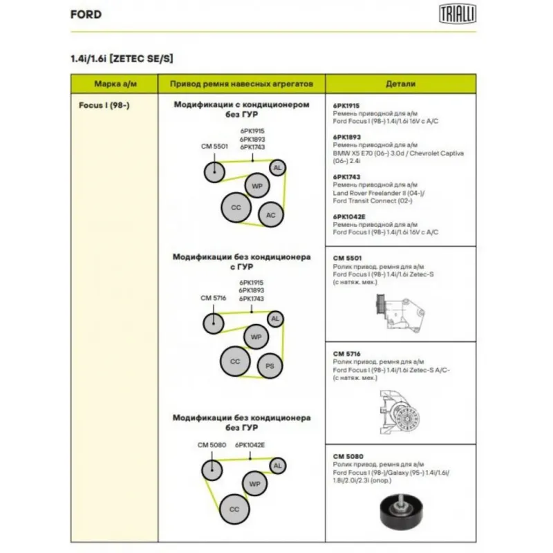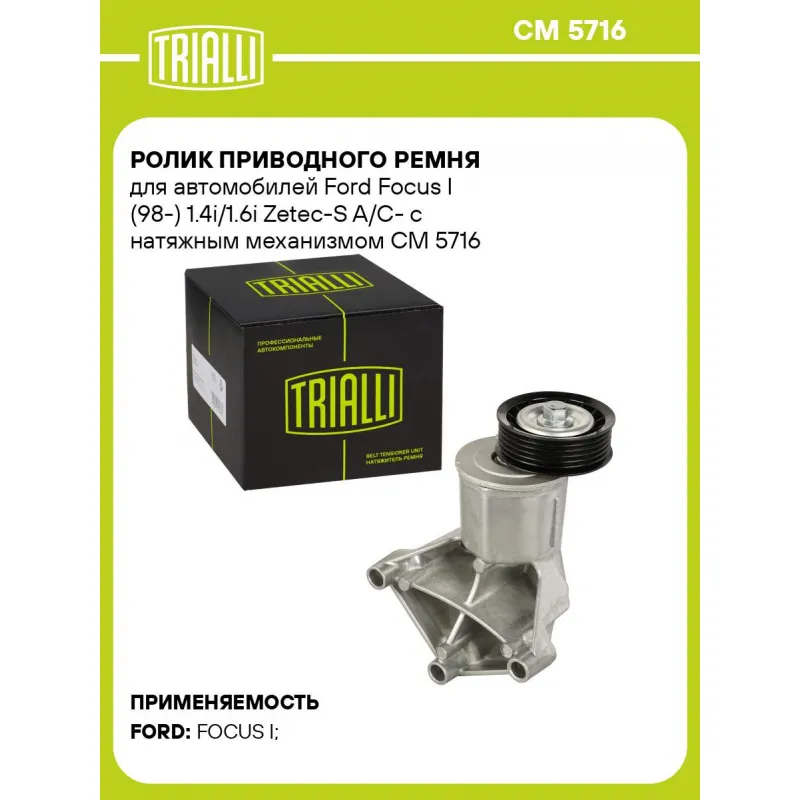 Ролик приводного ремня для автомобилей Ford Focus I (98-) 1.4i/1.6i Zetec-S A/C- с натяжным механизмом Характеристики: Артикул: CM 5716 OEM номера: 1 215 780, 1 114 737, 1075588, 1100699, 98MF-6A228-BC, 98MF-6A228-BD, 98MF-6A228-BE Сопутствующие товары:: 6PK1915, 6PK1893, 6PK1743, 6PK1042E, CM 5501, CM 5080 Сопутствующий товар: Ремни: 6PK1915, 6PK1893, 6PK1743, 6PK1042E Количество на автомобиль: 1 Внешний диаметр, мм: 72,5 Ширина, мм: 25 Гарантийный срок: 2 года/60 000 км. Материал: Комбинированный Товарная линейка: BLACK Комплектация: Ролик привод. ремня с натяж. мех. - 1 шт Гарантия: от 1 года.