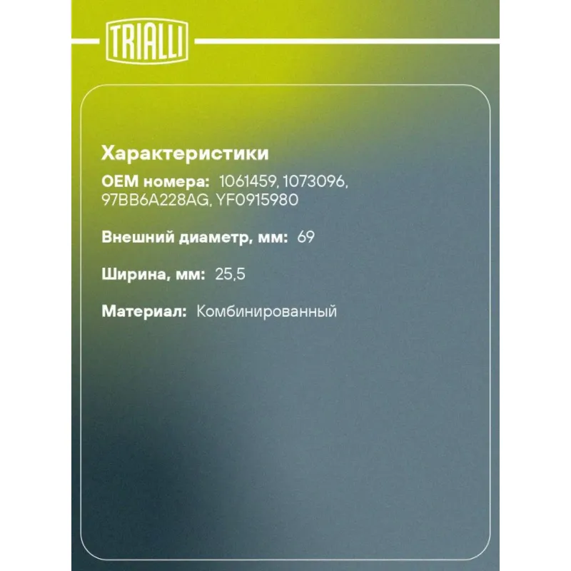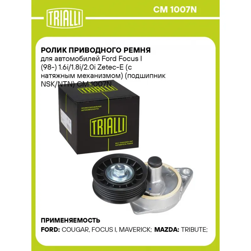 Ролик приводного ремня для автомобилей Ford Focus I (98-) 1.6i/1.8i/2.0i Zetec-E (с натяжным механизмом) (подшипник NSK/NTN) Характеристики: Артикул: CM 1007N OEM номера: 1061459, 1073096, 97BB6A228AG, YF0915980 Ширина, мм: 25.5 Внешний диаметр, мм: 69 Внутренний диаметр, мм: 8 Гарантийный срок: 2 года/80 000 км. Количество на а... Читать полностью →