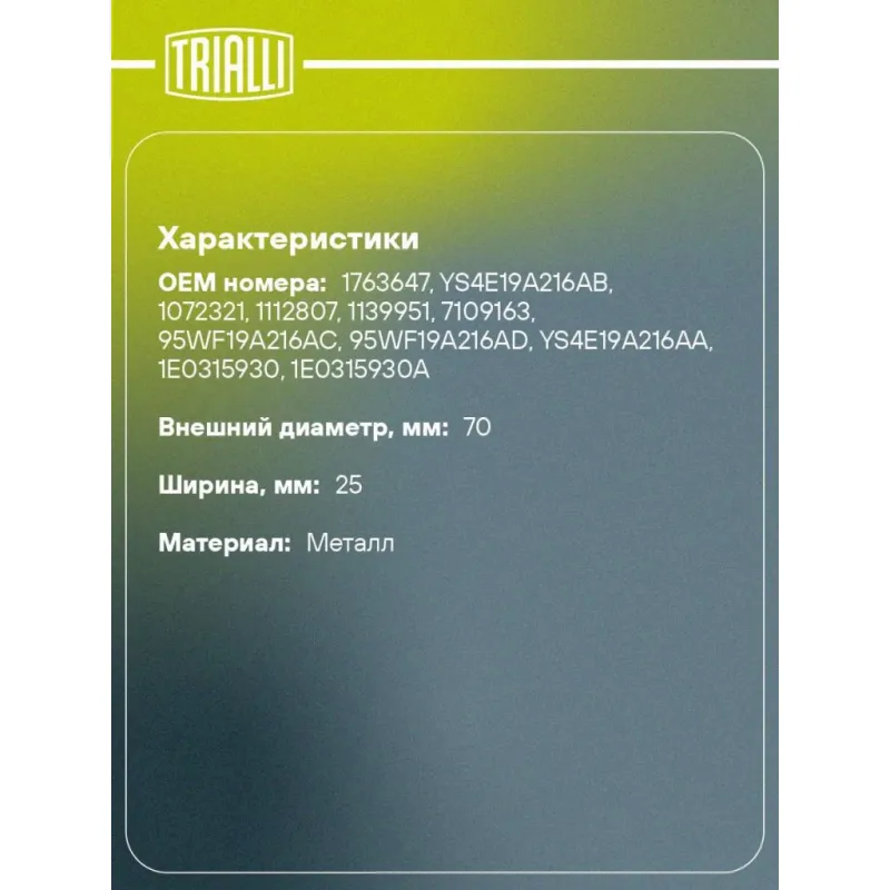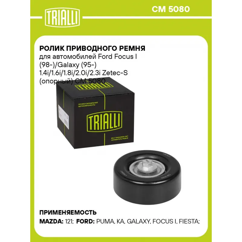 Ролик приводного ремня для автомобилей Ford Focus I (98-)/Galaxy (95-) 1.4i/1.6i/1.8i/2.0i/2.3i Zetec-S (опорный) Характеристики: Артикул: CM 5080 OEM номера: 1763647, YS4E19A216AB, 1072321, 1112807, 1139951, 7109163, 95WF19A216AC, 95WF19A216AD, YS4E19A216AA, 1E0315930, 1E0315930A Сопутствующие товары:: 6PK1915, 6PK1893, 6PK1743, 6PK1042E, CM 5501, CM 5716 Сопутствующий товар: Ролики приводного ремня: CM 5501, CM 5716 Количество на автомобиль: 1 Внешний диаметр, мм: 70 Внутренний диаметр, мм: 8 Ширина, мм: 25 Гарантийный срок: 2 года/60 000 км. Материал: Металл Сопутствующий товар: Ремни: 6PK1915, 6PK1893, 6PK1743, 6PK1042E Товарная линейка: BLACK Комплектация: Ролик приводного ремня - 1 шт Гарантия: от 1 года.
