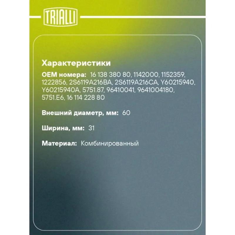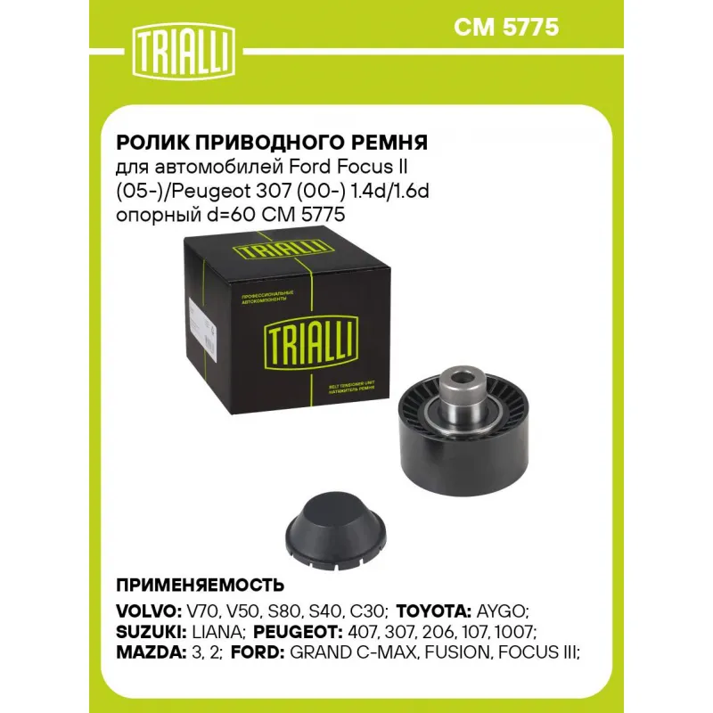 Ролик приводного ремня для автомобилей Ford Focus II (05-)/Peugeot 307 (00-) 1.4d/1.6d опорный d=60 Характеристики: Артикул: CM 5775 OEM номера: 16 138 380 80, 1142000, 1152359, 1222856, 2S6119A216BA, 2S6119A216CA, Y60215940, Y60215940A, 5751.87, 96410041, 9641004180, 5751.E6, 16 114 228 80, 5751.F4, 4917073J00, 13570YV010, 30637505, 30758108, 1624447, 2S61-19A216-BC, 2S6119A216BB Сопутствующие товары:: 6PK976, 6PK962, 6PK800, CM 5275, CM 5729 Сопутствующий товар: Ролики приводного ремня: CM 5275, CM 5729 Сопутствующий товар: Ремни: 6PK976, 6PK962, 6PK800 Количество на автомобиль: 1 Внешний диаметр, мм: 60 Внутренний диаметр, мм: 22 Ширина, мм: 31 Гарантийный срок: 2 года/60 000 км. Материал: Комбинированный Товарная линейка: BLACK Комплектация: Ролик приводного ремня - 1 шт Гарантия: от 1 года.