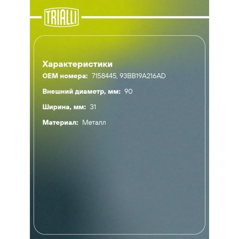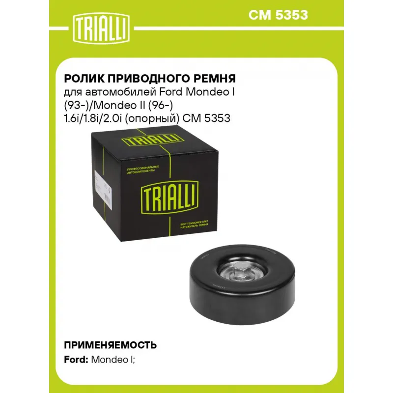 Ролик приводного ремня для автомобилей Ford Mondeo I (93-)/Mondeo II (96-) 1.6i/1.8i/2.0i (опорный) Характеристики: Артикул: CM 5353 OEM номера: 7158445, 93BB19A216AD Сопутствующие товары:: 6PK2100, 6PK2080, 6PK2125, CM 5931 Сопутствующий товар: Ролики приводного ремня: CM 5931 Количество на автомобиль: 1 Внешний диаметр, мм: 90 Внутренний диаметр, мм: 10 Ширина, мм: 31 Гарантийный срок: 2 года/60 000 км. Материал: Металл Сопутствующий товар: Ремни: 6PK2100, 6PK2080, 6PK2125 Товарная линейка: BLACK Подходит для авто: Ford Mondeo I (93-) Для проверки применяемости отправьте VIN автомобиля через вкладку "Есть вопросы о товаре?" Комплектация: Ролик приводного ремня - 1 шт Гарантия: от 1 года.