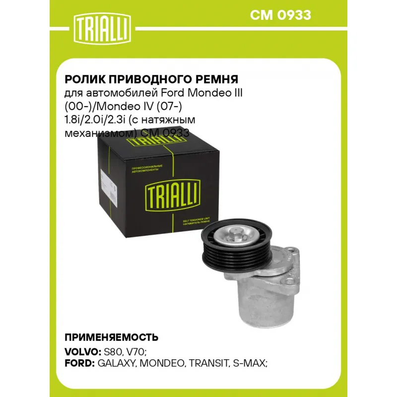 Ролик приводного ремня для автомобилей Ford Mondeo III (00-)/Mondeo IV (07-) 1.8i/2.0i/2.3i (с натяжным механизмом) Характеристики: Артикул: CM 0933 OEM номера: 1371224, 1306666, 1127103, 1S7Q6A228AE, 1S7Q6A228AD, 1S7Q6A228AC Сопутствующий товар: Ролики приводного ремня: CM 5099, CM 5093, CM 1012, CM 3006 Количество на автомобиль: 1 Сопутствующие товары:: CM 5099, CM 5093, CM 1012, CM 3006 Внешний диаметр, мм: 73 Внутренний диаметр, мм: 8 Ширина, мм: 29 Гарантийный срок: 2 года/60 000 км. Материал: Комбинированный Товарная линейка: BLACK Комплектация: Ролик привод. ремня с натяж. мех. - 1 шт Гарантия: от 1 года.