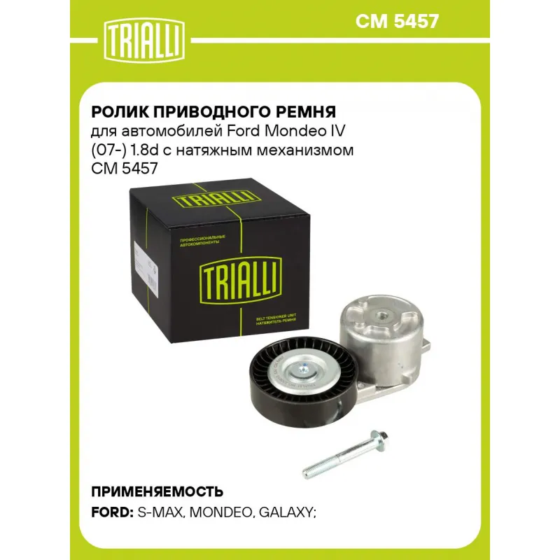 Ролик приводного ремня для автомобилей Ford Mondeo IV (07-) 1.8d с натяжным механизмом Характеристики: Артикул: CM 5457 OEM номера: 1 376 316, 1 387 199 , 1 425 510, 1 567 809 Сопутствующие товары:: 6PK1720, 6PK1743, 6PK1420, 6PK1413, 6PK1460, 6PK1685, 6PK1520, 6PK1360, CM 5157, CM 5096 Количество на автомобиль: 1 Внешний диаметр, мм: 76 Внутренний диаметр, мм: 8 Ширина, мм: 22 Гарантийный срок: 2 года/60 000 км. Материал: Комбинированный Сопутствующий товар: Ремни: 6PK1720, 6PK1743, 6PK1420, 6PK1413, 6PK1460, 6PK1685, 6PK1520, 6PK1360 Товарная линейка: BLACK Комплектация: Ролик привод. ремня с натяж. мех. - 1 шт Гарантия: от 1 года.
