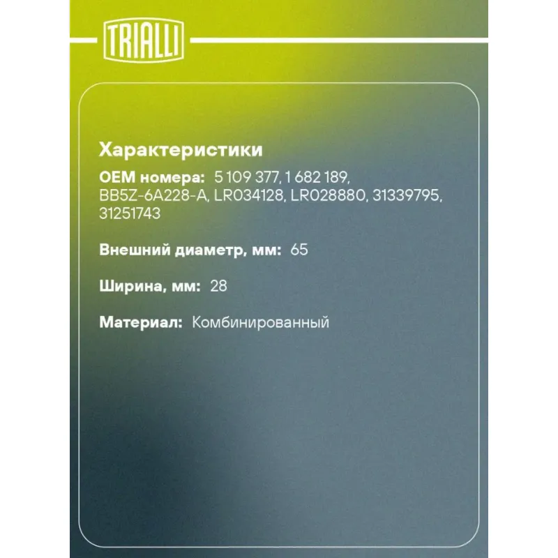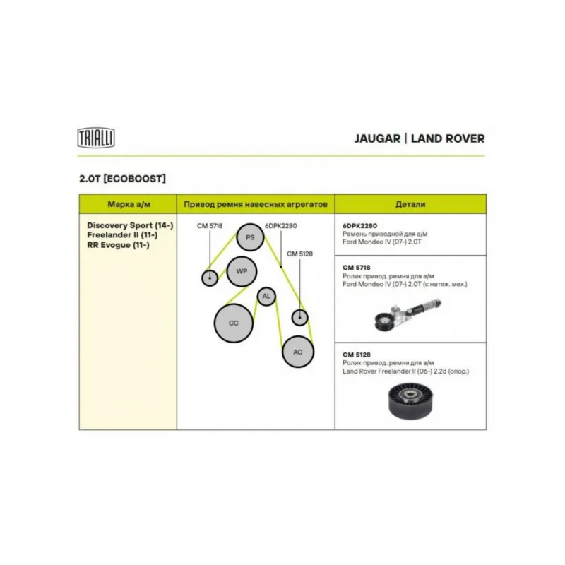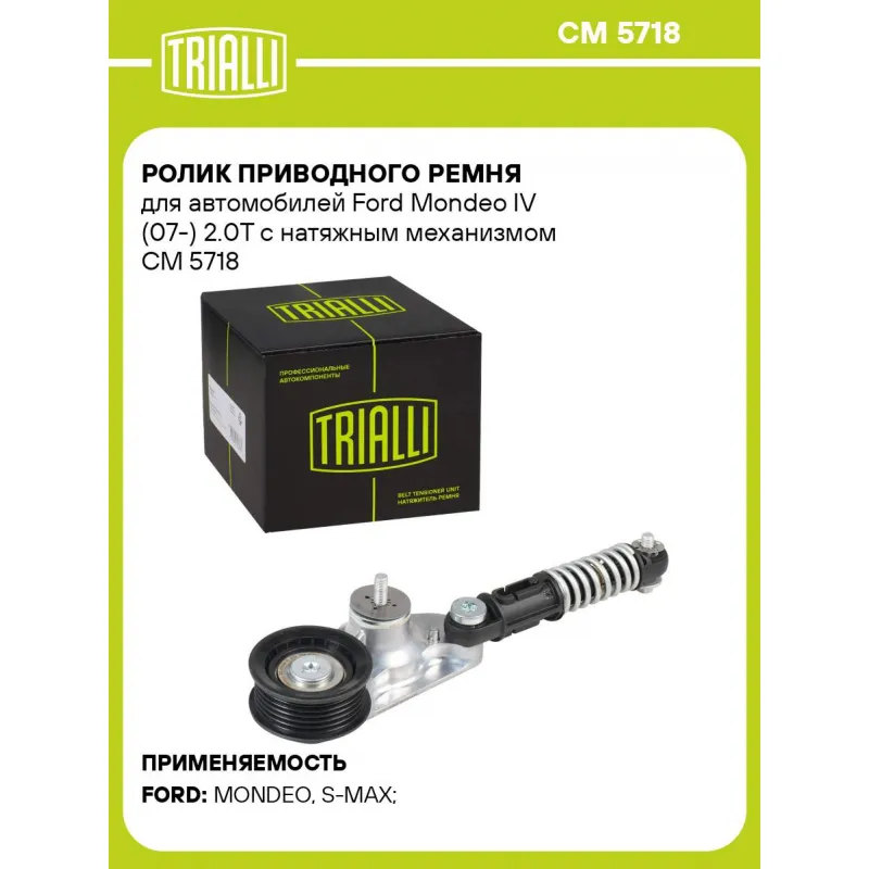 Ролик приводного ремня для автомобилей Ford Mondeo IV (07-) 2.0T с натяжным механизмом Характеристики: Артикул: CM 5718 OEM номера: 5 109 377, 1 682 189, BB5Z-6A228-A, LR034128, LR028880, 31339795, 31251743 Сопутствующие товары:: 6DPK2280, CM 5582 Сопутствующий товар: Ролики приводного ремня: CM 5582 Сопутствующий товар: Ремни: 6DPK2280 Количество на автомобиль: 1 Внешний диаметр, мм: 65 Ширина, мм: 28 Гарантийный срок: 2 года/60 000 км. Материал: Комбинированный Товарная линейка: BLACK Комплектация: Ролик привод. ремня с натяж. мех. - 1 шт Гарантия: от 1 года.