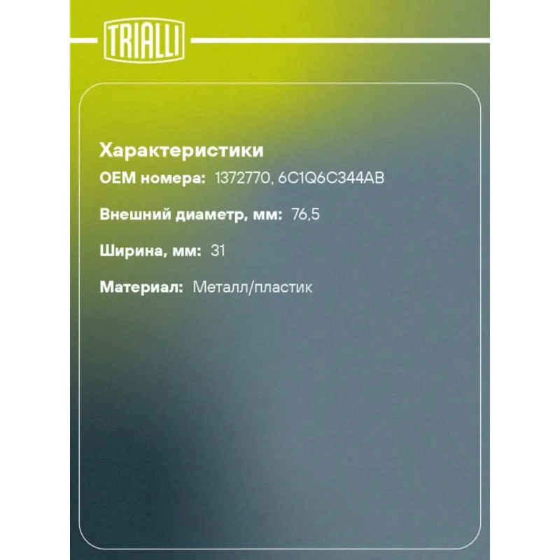 Ролик приводного ремня для автомобилей Ford Transit (06-) 2.4d (опорный) Характеристики: Артикул: CM 5348 OEM номера: 1372770, 6C1Q6C344AB Сопутствующие товары:: 7PK2842, 7PK2710, 7PK2682, CM 5103, CM 5255, CM 5370, CM 5100 Сопутствующий товар: Ролики приводного ремня: CM 5103, CM 5255, CM 5370, CM 5100, CM 5349 Количество на автомобиль: 1 Внешний диаметр, мм: 76,5 Внутренний диаметр, мм: 10 Ширина, мм: 31 Гарантийный срок: 2 года/60 000 км. Материал: металл/пластик Сопутствующий товар: Ремни: 7PK2842, 7PK2710, 7PK2682 Товарная линейка: BLACK Подходит для авто: Ford Transit VII (06-) Для проверки применяемости отправьте VIN автомобиля через вкладку "Есть вопросы о товаре?" Комплектация: Ролик приводного ремня - 1 шт Гарантия: от 1 года.