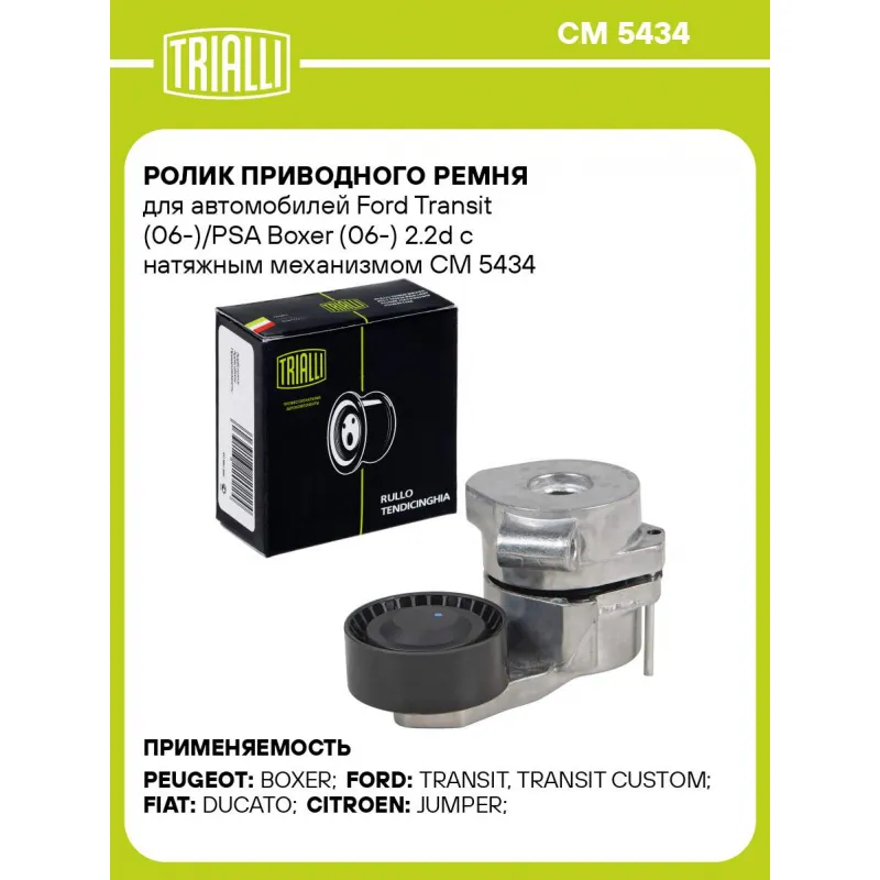 Ролик приводного ремня для автомобилей Ford Transit (06-)/PSA Boxer (06-) 2.2d с натяжным механизмом Характеристики: Артикул: CM 5434 OEM номера: 9658142780, 16 11 424 780, 5751.F2, 1 420 513, 6C1Q 6A228 AB, 5751 F2, 327476, 327386 Сопутствующие товары:: CM 5606, CM 5623, CM 5636, CM 5514, CM 5510 Сопутствующий товар: Ролики приводного ремня: CM 5606, CM 5623, CM 5636, CM 5514, CM 5510 Количество на автомобиль: 1 Внешний диаметр, мм: 65 Ширина, мм: 26 Гарантийный срок: 2 года/60 000 км. Товарная линейка: BLACK Комплектация: Ролик привод. ремня. с натяж. мех. - 1 шт Гарантия: от 1 года.