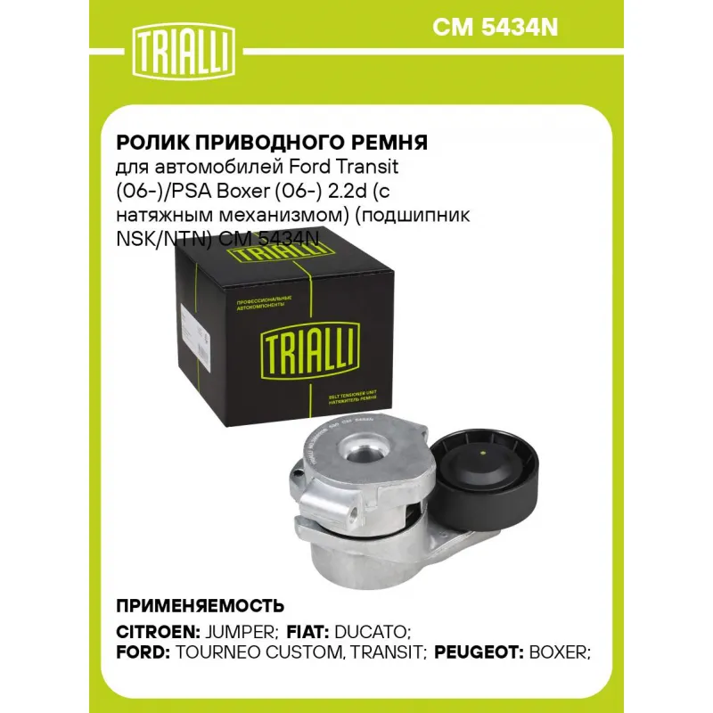 Ролик приводного ремня для автомобилей Ford Transit (06-)/PSA Boxer (06-) 2.2d (с натяжным механизмом) (подшипник NSK/NTN) Характеристики: Артикул: CM 5434N OEM номера: 9658142780, 5751.F2, 16 11 424 780, 6C1Q 6A228 AB, 1 420 513, 5751 F2, 327476, 327386 Ширина, мм: 26 Внешний диаметр, мм: 65 Гарантийный срок: 2 года/80 000 км. ... Читать полностью →