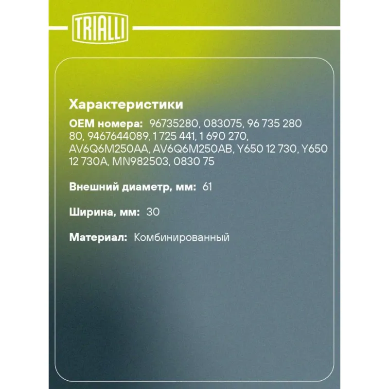 Ролик приводного ремня для автомобилей Peugeot 408 (12-)/Ford Transit (13-) 1.4d/1.5d/1.6d (опорный) Характеристики: Артикул: CM 5431 OEM номера: 96735280, 083075, 96 735 280 80, 9467644089, 1 725 441, 1 690 270, AV6Q6M250AA, AV6Q6M250AB, Y650 12 730, Y650 12 730A, MN982503, 0830 75, SU001-A0150, 3646454, 31 339 887, 31 330 200 Особенности конструкции:: CM 6112 Ширина, мм: 30 Внешний диаметр, мм: 61 Внутренний диаметр, мм: 10,2 Количество на автомобиль: 1 Материал: Комбинированный Гарантийный срок: 2 года/60 000 км. Товарная линейка: BLACK Комплектация: Ролик приводного ремня - 1 шт Гарантия: от 1 года.