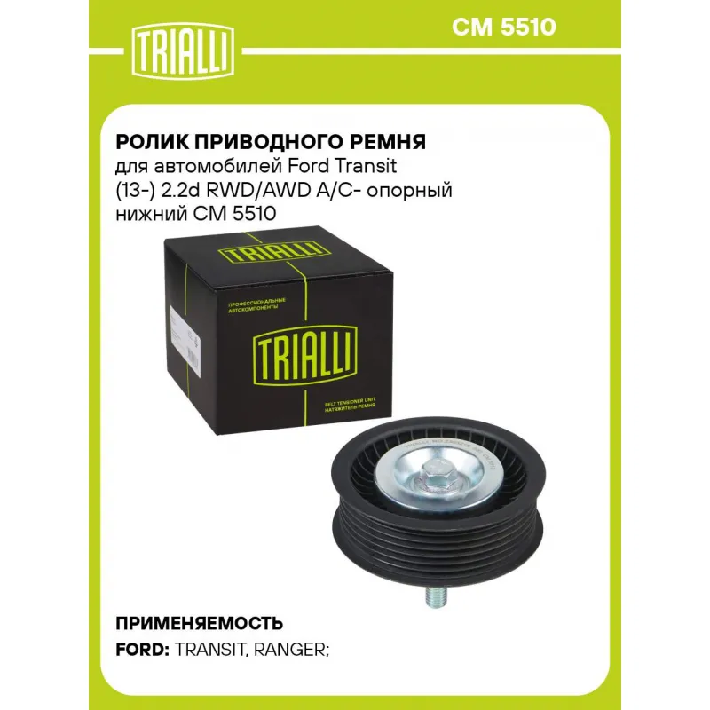 Ролик приводного ремня для автомобилей Ford Transit (13-) 2.2d RWD/AWD А/С- опорный нижний Характеристики: Артикул: CM 5510 OEM номера: A6422300342, 6422300342, 1717609, BK3Q6C344BA Сопутствующие товары:: CM 5434, CM 5606, CM 5623, CM 5636, CM 5514 Сопутствующий товар: Ролики приводного ремня: CM 5434, CM 5606, CM 5623, CM 5636, CM 5514 Количество на автомобиль: 1 Внешний диаметр, мм: 85 Внутренний диаметр, мм: 10 Ширина, мм: 30 Гарантийный срок: 2 года/60 000 км. Материал: Комбинированный Товарная линейка: BLACK Комплектация: Ролик приводного ремня - 1 шт Гарантия: от 1 года.