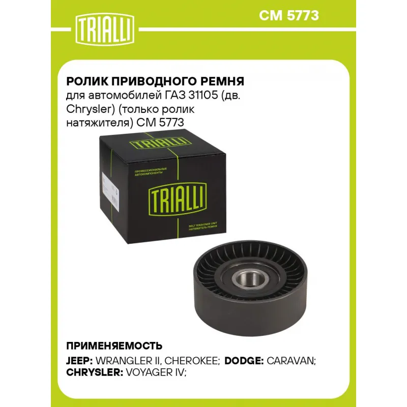 Ролик приводного ремня для автомобилей ГАЗ 31105 (дв. Chrysler) (только ролик натяжителя) Характеристики: Артикул: CM 5773 OEM номера: 04861277AD, 4861277AD, K04861277AD, K04861277AB, 4861277AB Сопутствующие товары:: 6PK1930, 6PK1653, 6PK1750, CM 5758, CM 5760, CM 5759, CM 1092 Сопутствующий товар: Ролики приводного ремня: CM 5778, CM 5759, CM 1092 Количество на автомобиль: 1 Внешний диаметр, мм: 70 Ширина, мм: 25 Гарантийный срок: 2 года/60 000 км. Сопутствующий товар: Ремни: 6PK1930, 6PK1653, 6PK1750 Товарная линейка: BLACK Комплектация: Ролик приводного ремня - 1 шт Гарантия: от 1 года.