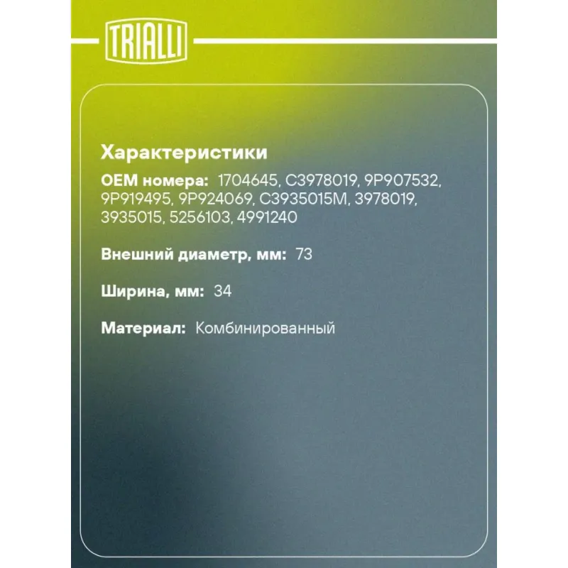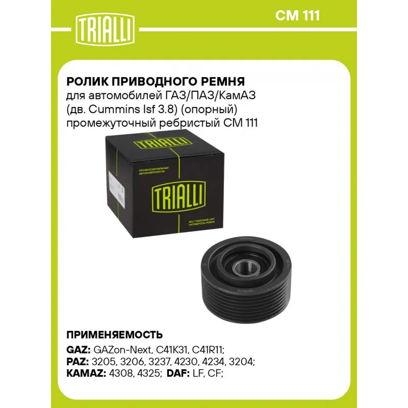 Ролик приводного ремня для автомобилей ГАЗ/ПАЗ/КамАЗ (дв. Cummins Isf 3.8) (опорный) промежуточный ребристый Характеристики: Артикул: CM 111 OEM номера: 1704645, C3978019, 9P907532, 9P919495, 9P924069, C3935015M, 3978019, 3935015, 5256103, 4991240 Сопутствующий товар: Ролики приводного ремня: CM 0781, CM 6043, CM 110 Количество на автомобиль: 1 Сопутствующие товары:: CM 110, CM 101, CM 105, CM 106 Внешний диаметр, мм: 73 Особенности конструкции:: дв. Cummins Isf 3.8 (ISBE, ISDE, 6CT) Внутренний диаметр, мм: 17 Ширина, мм: 34 Гарантийный срок: 2 года/60 000 км. Материал: Комбинированный Сопутствующий товар: Ремни: 8PK2190, 8PK2124, 8PK2015, 8PK2075 Товарная линейка: BLACK Подходит для авто: ГАЗ GAZon-Next (14-), C41K31, C41R11, Valday, 33106 ПАЗ 3205, 3206, 3237, 4230, 4234, 3204 КамаАЗ 4308, 4325 DAF LF (06-), CF (13-) Для проверки применяемости отправьте VIN автомобиля через вкладку "Есть вопросы о товаре?" Комплектация: Ролик натяжения ремня - 1 шт Гарантия: от 1 года.