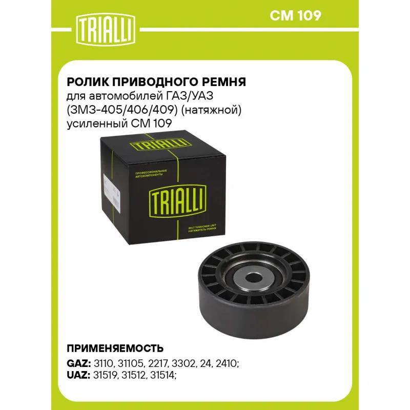Ролик приводного ремня для автомобилей ГАЗ/УАЗ (ЗМЗ-405/406/409) (натяжной) усиленный Характеристики: Артикул: CM 109 OEM номера: 6305RS, 406-1308080-21, 406.1006.8080-21, 406-1308080, 406-1308080-20, 406.1308067-02, 406-1308080-24, 406130808028 Сопутствующий товар: Ролики приводного ремня: CM 1091, CM 0301, CM 103 Количество на автомобиль: 1 Сопутствующие товары:: CM 103, CM 0301 Внешний диаметр, мм: 80 Особенности конструкции:: ГАЗ Евро 2 (дв. змз. 405, 406, 409) усиленный Внутренний диаметр, мм: 12 Ширина, мм: 30 Гарантийный срок: 2 года/60 000 км. Материал: Комбинированный Сопутствующий товар: Ремни: 6PK1370, 6PK1210, 6PK1220, 6PK1275 Товарная линейка: BLACK Подходит для авто: ГАЗ 3110, 31105, 2217, 2217, 2217, 3302, 3302, 3302, 24, 24, 2410, 2410, Gazelle, 2705, 2705, 2705, 3111, 3110, 3110, 3110, 3110, 31105, 31105, 31105, 31105, 2217, 2217, 3302, 3302, 24, 2410, Gazelle-Business, 2705, 2705 УАЗ 31519, 31512, 31514 Для проверки применяемости отправьте VIN автомобиля через вкладку "Есть вопросы о товаре?" Комплектация: Ролик приводного ремня - 1 шт Гарантия: от 1 года.