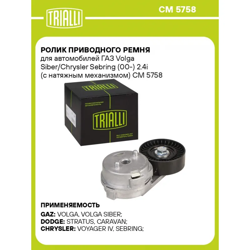 Ролик приводного ремня для автомобилей ГАЗ Volga Siber/Chrysler Sebring (00-) 2.4i (с натяжным механизмом) Характеристики: Артикул: CM 5758 OEM номера: 04593633AA, 04861 514AA Сопутствующие товары:: 6PK1250, 4PK905 Сопутствующий товар: Ролики приводного ремня: CM 5773, CM 5759, CM 1092 Количество на автомобиль: 1 Внешний диаметр, мм: 70 Ширина, мм: 24 Гарантийный срок: 2 года/60 000 км. Сопутствующий товар: Ремни: 6PK1250, 4PK905 Товарная линейка: BLACK Комплектация: Ролик привод. ремня с натяж. мех. - 1 шт Гарантия: от 1 года.